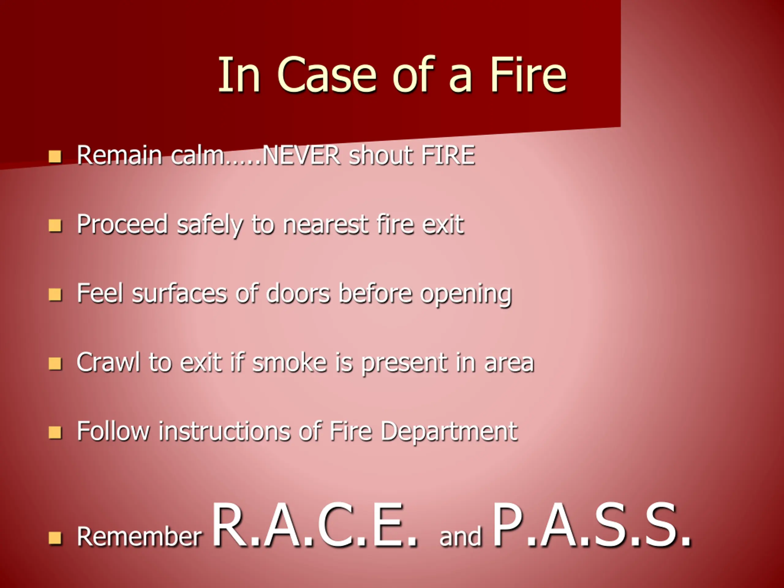 In Case of a Fire Remain calm ..NEVER shout FIRE Proceed safely to nearest fire exit Feel surfaces of doors before opening Crawl to exit if smoke is present in area Follow instructions of Fire Department Remember R.A.C.E. and P.A.S.S.