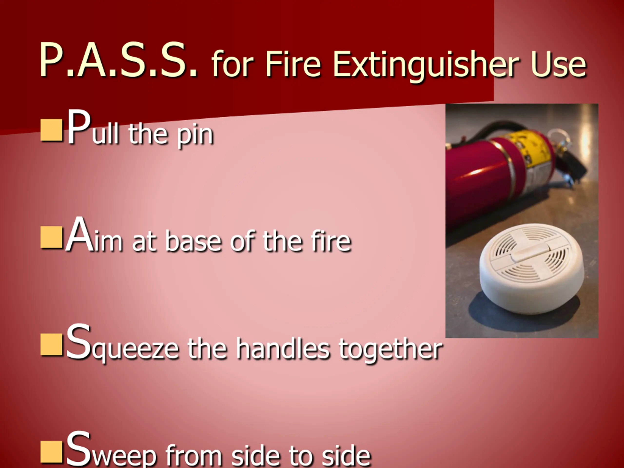 P.A.S.S. for Fire Extinguisher Use Pull the pin Aim at base of the fire Squeeze the handles together Sweep from side to side