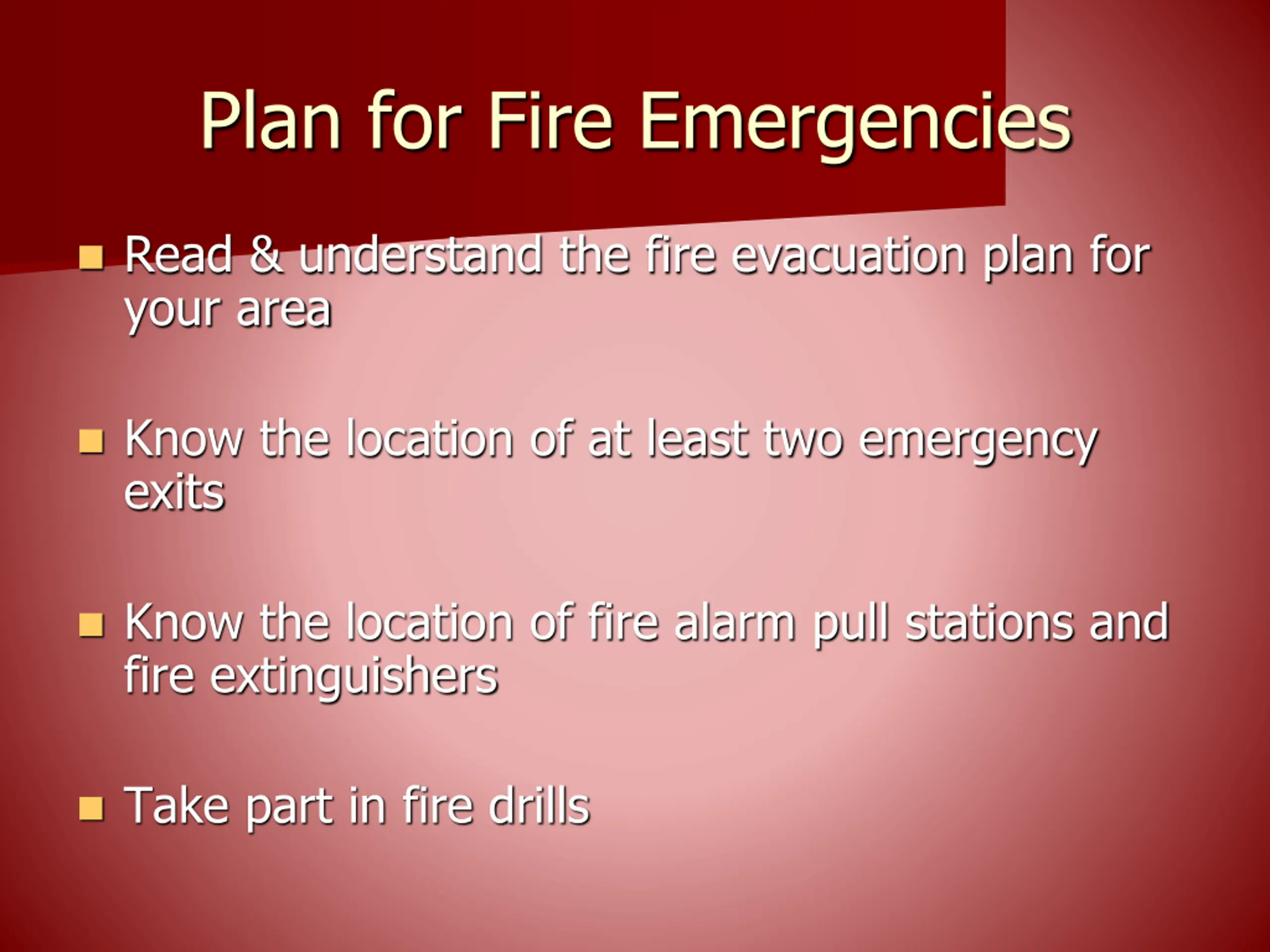 Plan for Fire Emergencies Read & understand the fire evacuation plan for your area Know the location of at least two emergency exits Know the location of fire alarm pull stations and fire extinguishers Take part in fire drills
