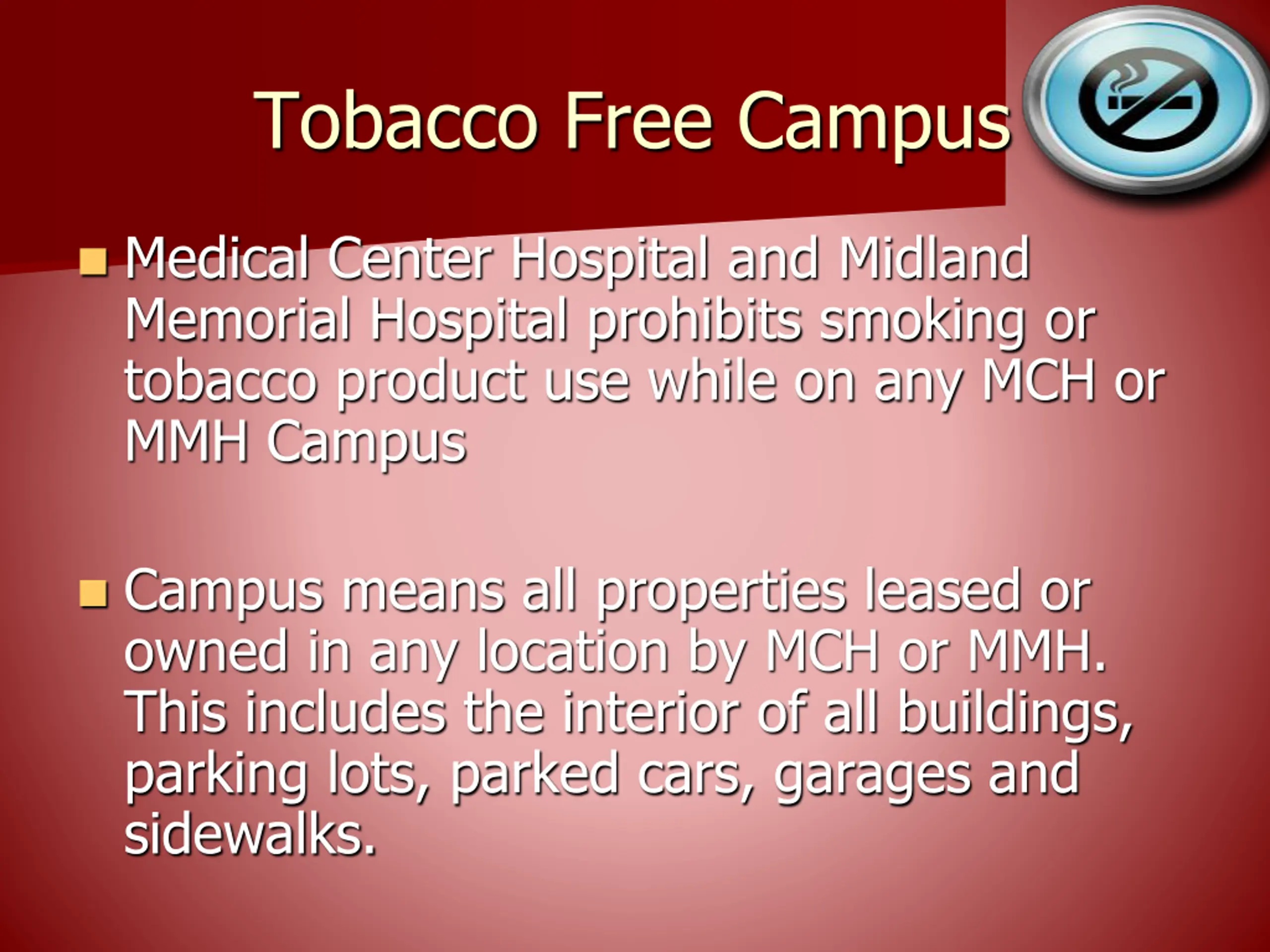 Tobacco Free Campus Medical Center Hospital and Midland Memorial Hospital prohibits smoking or tobacco product use while on any MCH or MMH Campus Campus means all properties leased or owned in any location by MCH or MMH. This includes the interior of all buildings, parking lots, parked cars, garages and sidewalks.