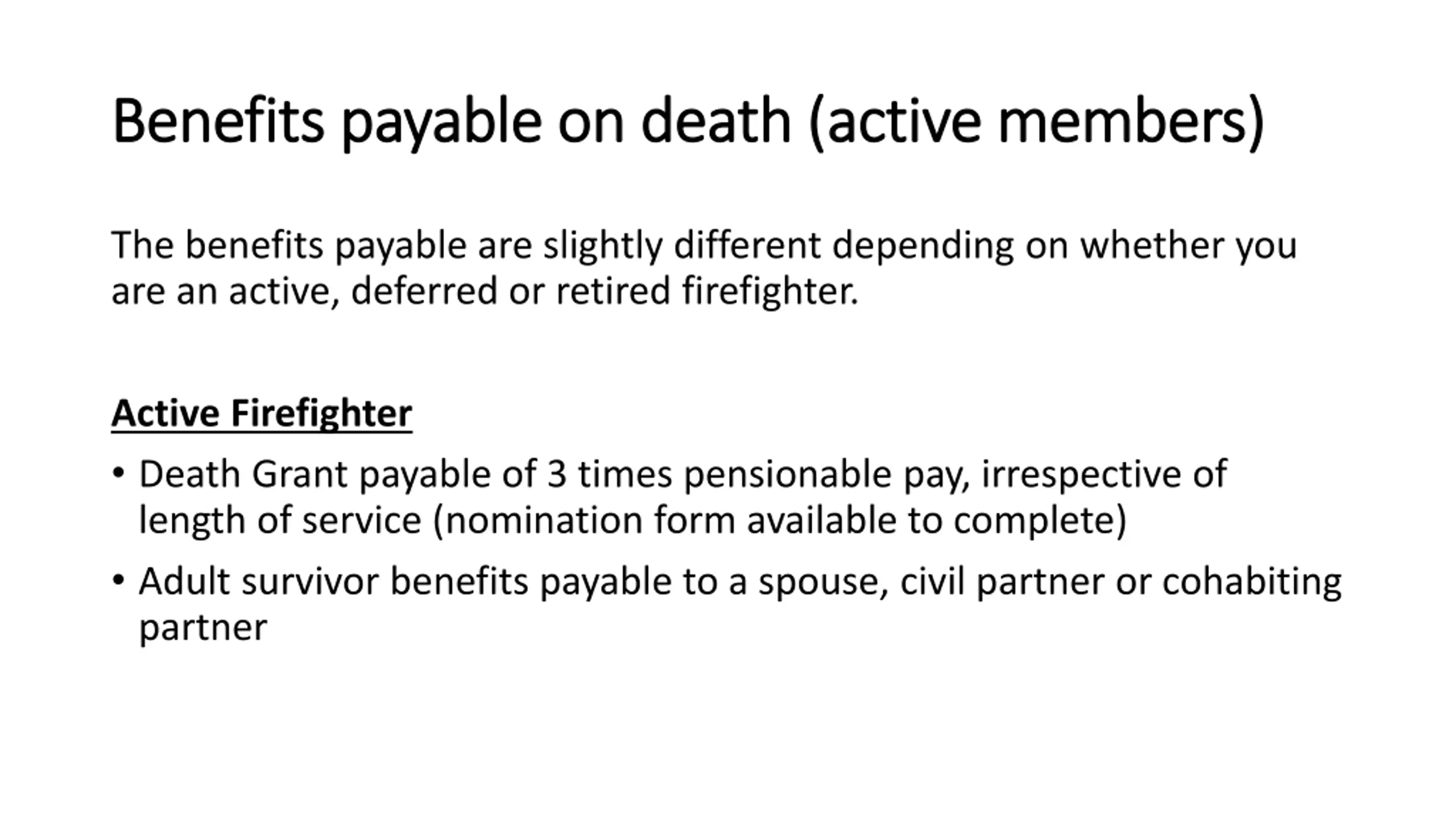 Benefits payable on death (active members) Benefits payable on death (active members) The benefits payable are slightly different depending on whether you are an active, deferred or retired firefighter. Active Firefighter Death Grant payable of 3 times pensionable pay, irrespective of length of service (nomination form available to complete) Adult survivor benefits payable to a spouse, civil partner or cohabiting partner