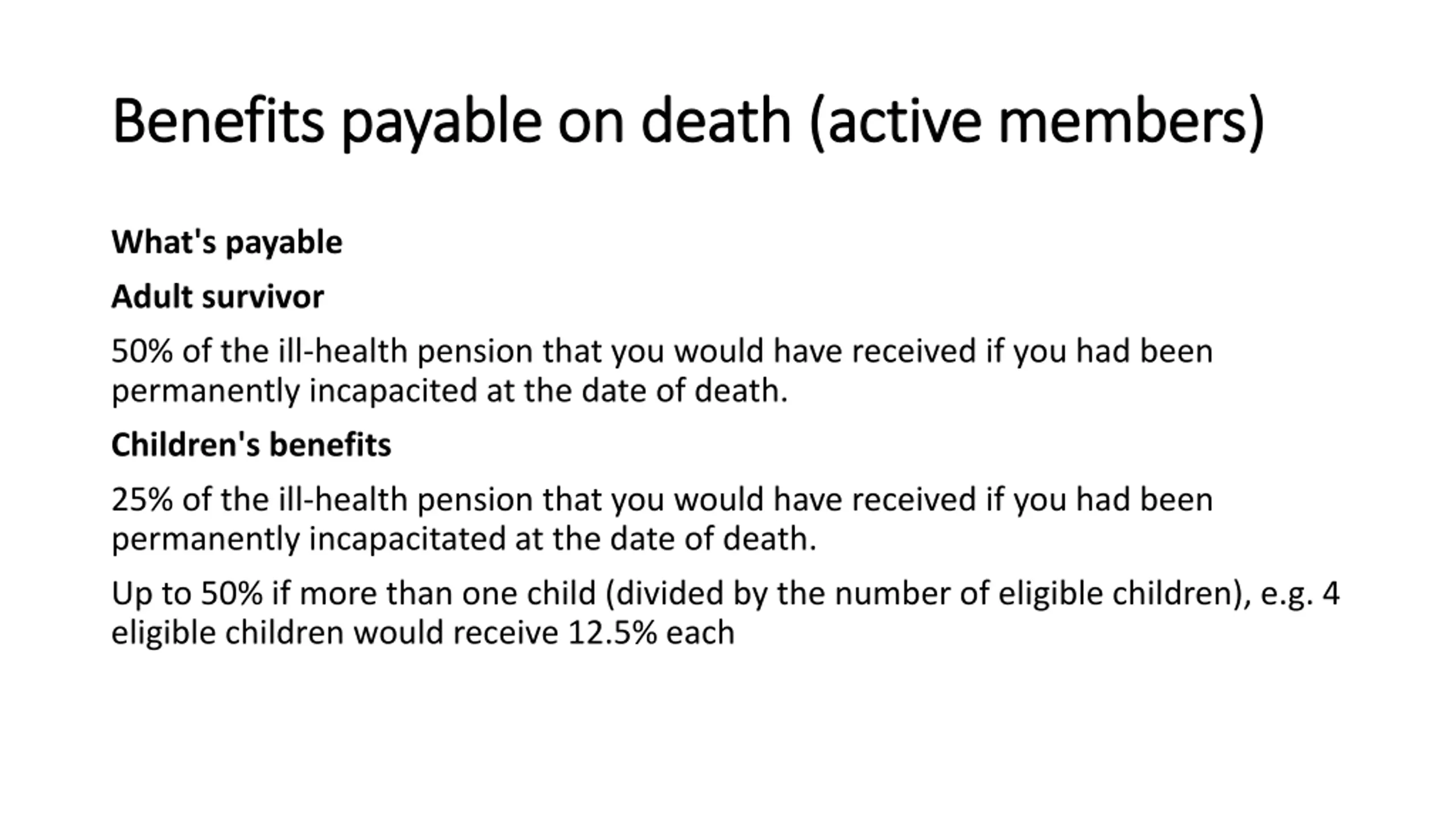 Benefits payable on death Benefits payable on death (active members) (active members) What's payable Adult survivor 50% of the ill-health pension that you would have received if you had been permanently incapacited at the date of death. Children's benefits 25% of the ill-health pension that you would have received if you had been permanently incapacitated at the date of death. Up to 50% if more than one child (divided by the number of eligible children), e.g. 4 eligible children would receive 12.5% each