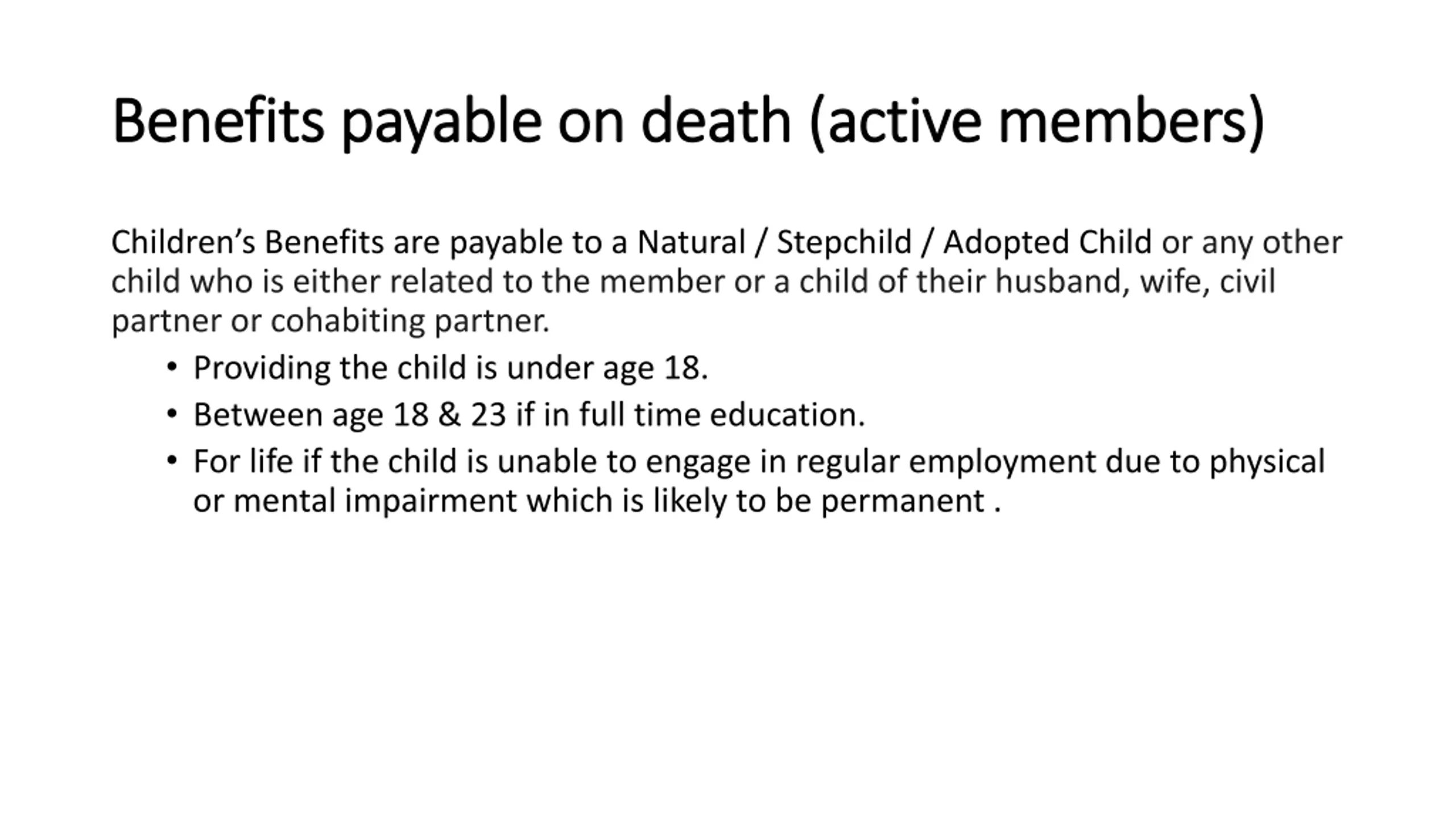 Benefits payable on death Benefits payable on death (active members) (active members) Children s Benefits are payable to a Natural / Stepchild / Adopted Child or any other child who is either related to the member or a child of their husband, wife, civil partner or cohabiting partner. Providing the child is under age 18. Between age 18 & 23 if in full time education. For life if the child is unable to engage in regular employment due to physical or mental impairment which is likely to be permanent .