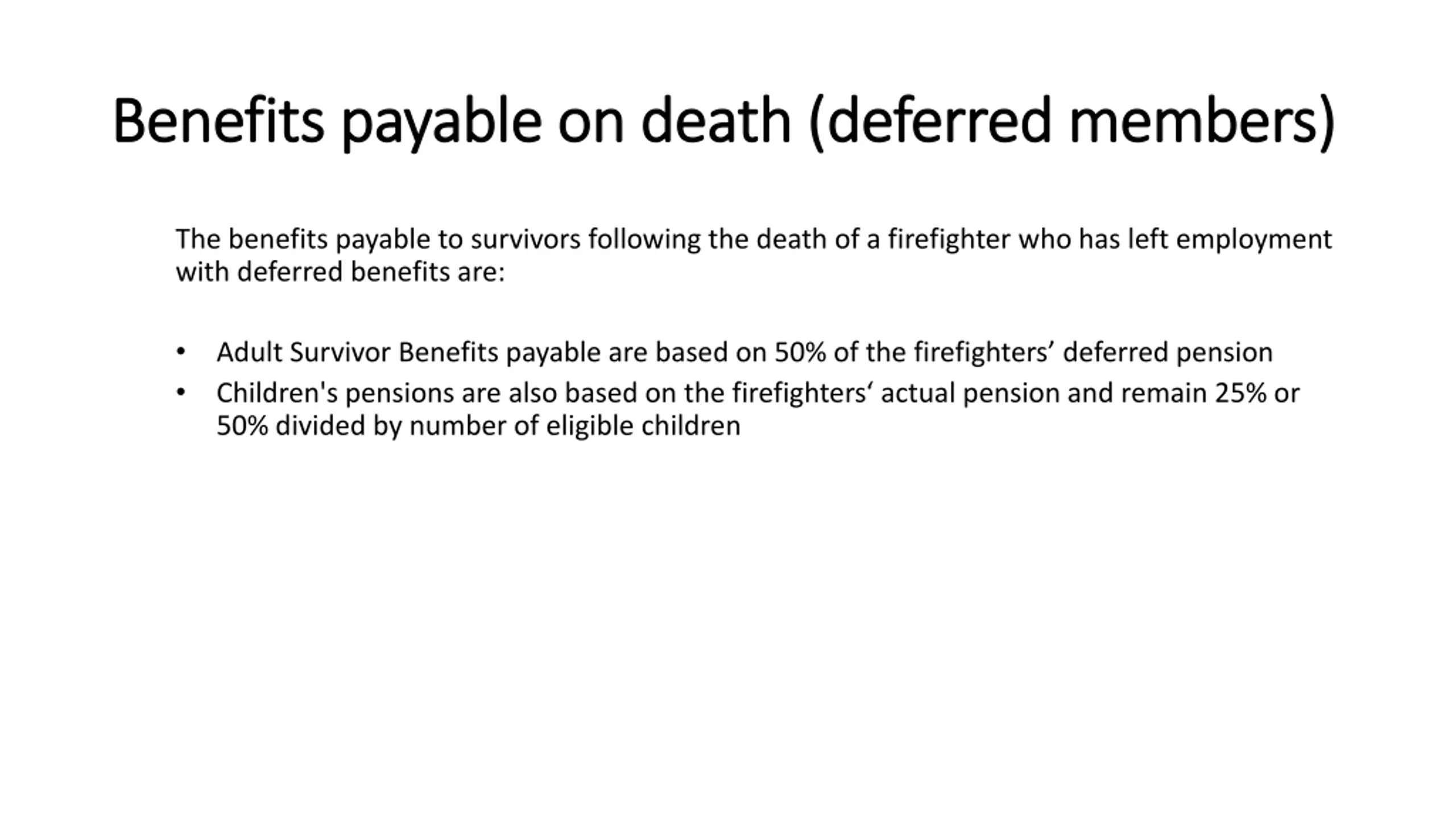 Benefits payable on death (deferred members) Benefits payable on death (deferred members) The benefits payable to survivors following the death of a firefighter who has left employment with deferred benefits are: Adult Survivor Benefits payable are based on 50% of the firefighters deferred pension Children's pensions are also based on the firefighters actual pension and remain 25% or 50% divided by number of eligible children