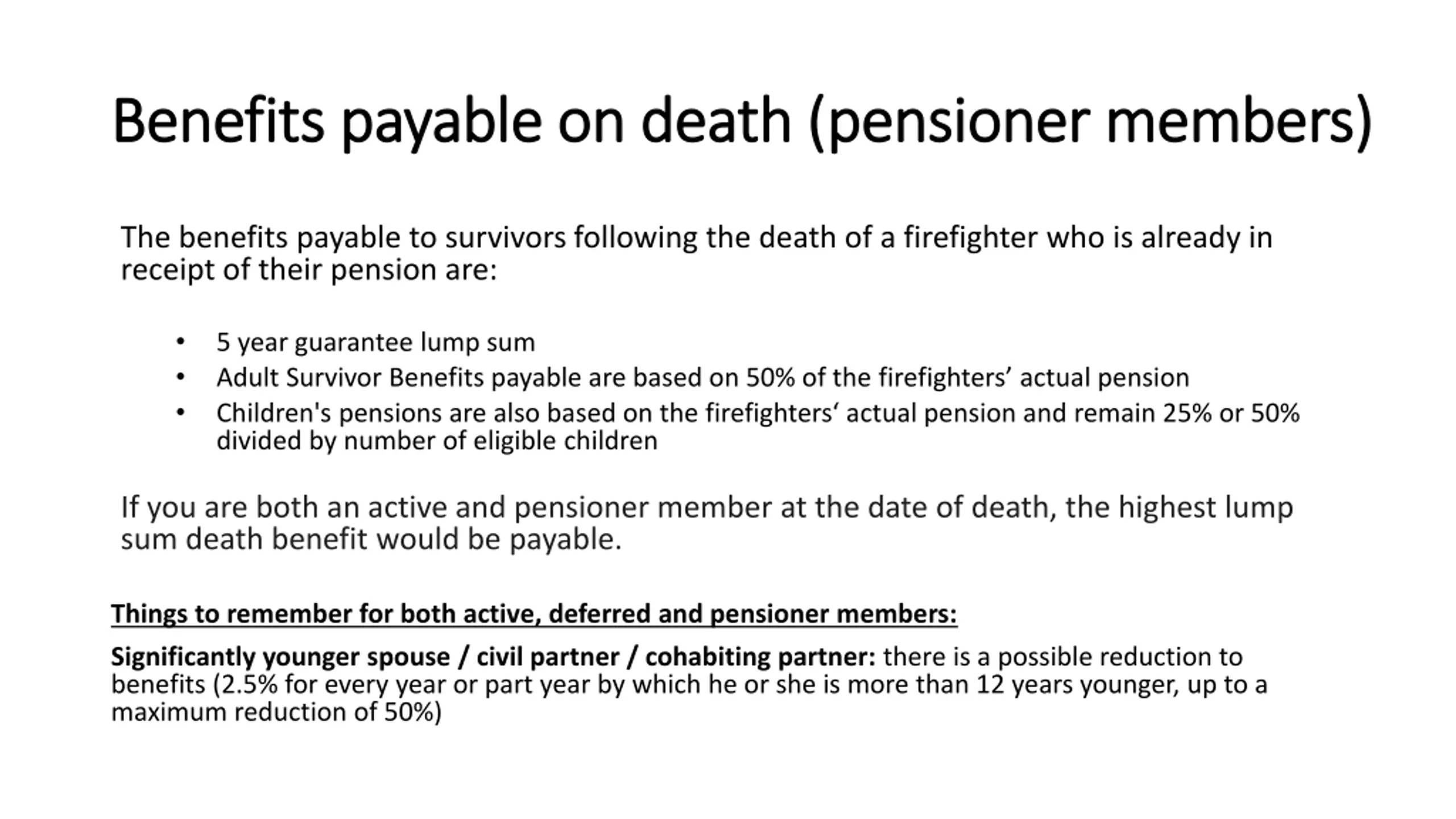 Benefits payable on death (pensioner members) Benefits payable on death (pensioner members) The benefits payable to survivors following the death of a firefighter who is already in receipt of their pension are: 5 year guarantee lump sum Adult Survivor Benefits payable are based on 50% of the firefighters actual pension Children's pensions are also based on the firefighters actual pension and remain 25% or 50% divided by number of eligible children If you are both an active and pensioner member at the date of death, the highest lump sum death benefit would be payable. Things to remember for both active, deferred and pensioner members: Significantly younger spouse / civil partner / cohabiting partner: there is a possible reduction to benefits (2.5% for every year or part year by which he or she is more than 12 years younger, up to a maximum reduction of 50%)