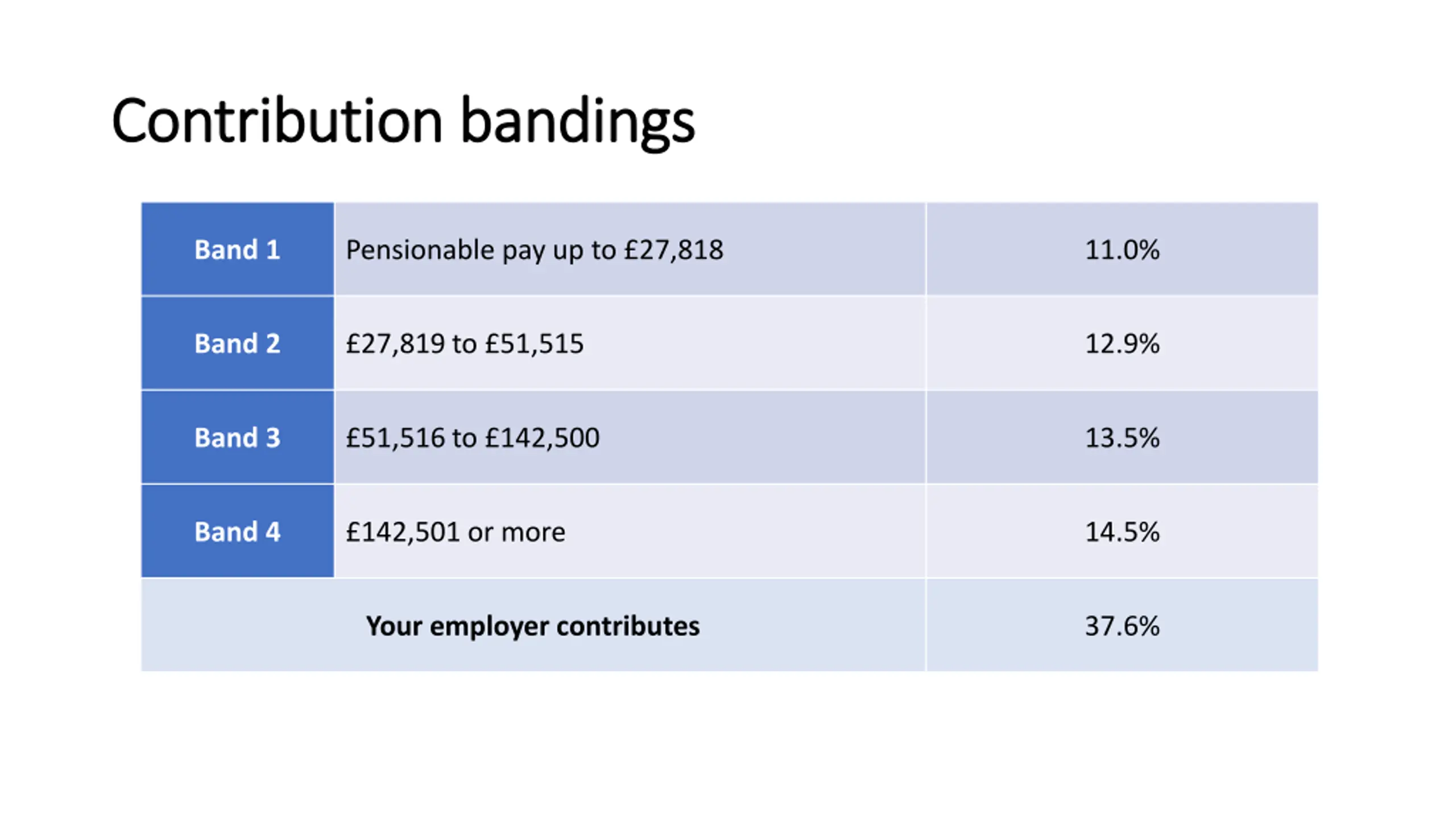 Contribution bandings Contribution bandings Band 1 Pensionable pay up to 27,818 11.0% Band 2 27,819 to 51,515 12.9% Band 3 51,516 to 142,500 13.5% Band 4 142,501 or more 14.5% Your employer contributes 37.6%