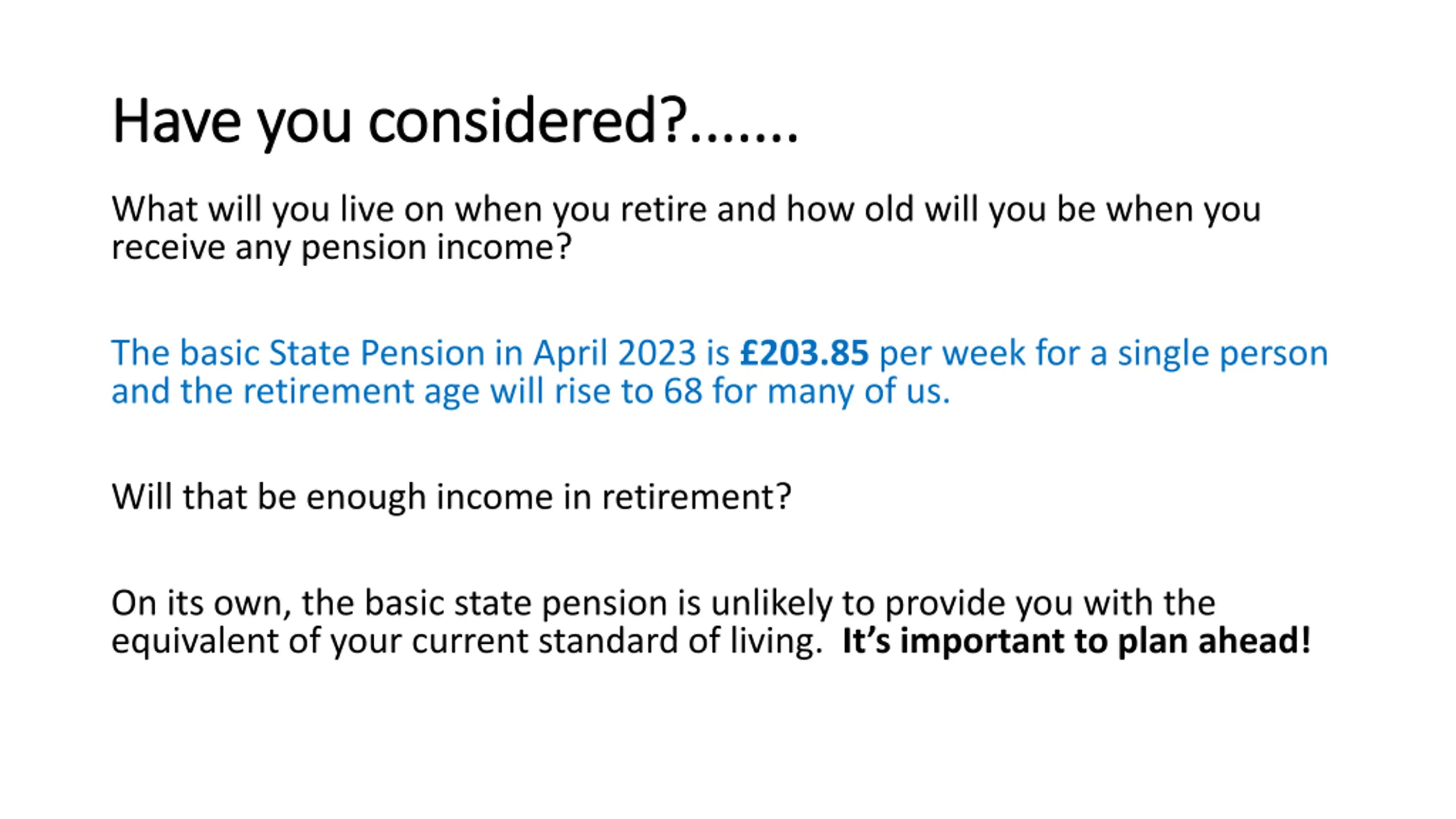Have you considered?....... Have you considered?....... What will you live on when you retire and how old will you be when you receive any pension income? The basic State Pension in April 2023 is 203.85 per week for a single person and the retirement age will rise to 68 for many of us. Will that be enough income in retirement? On its own, the basic state pension is unlikely to provide you with the equivalent of your current standard of living. It s important to plan ahead!