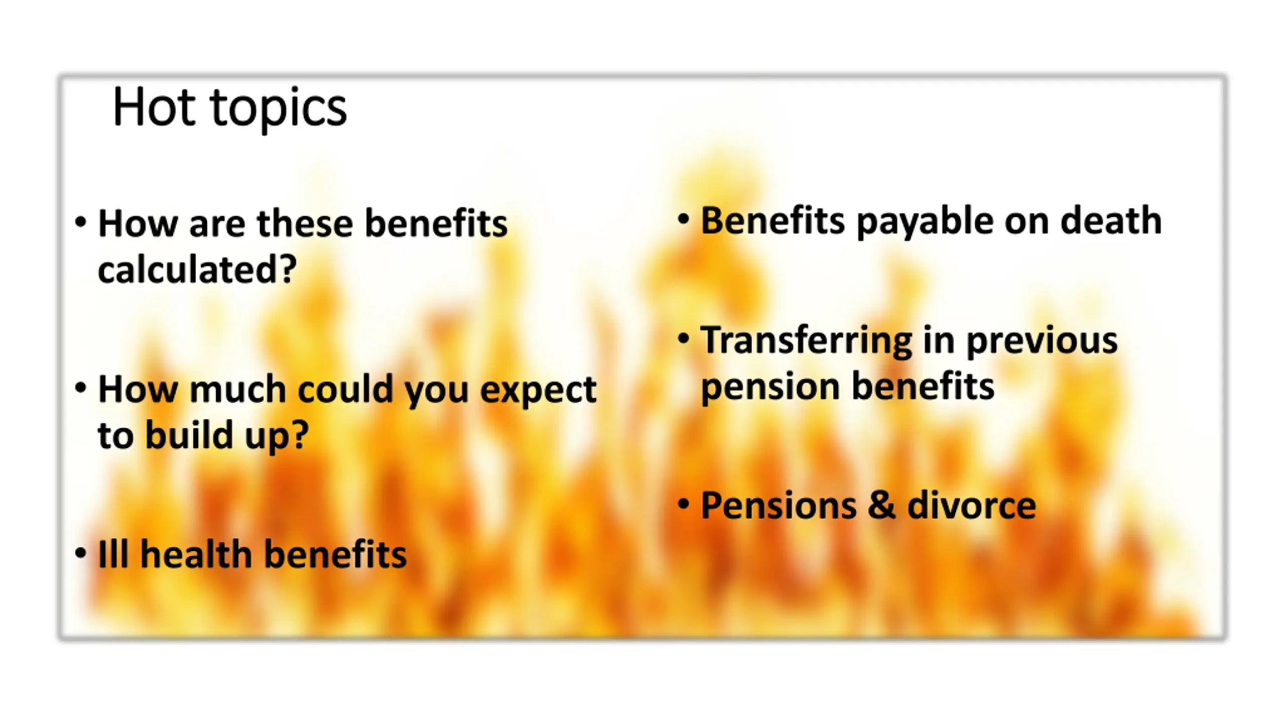 Hot topics Hot topics Benefits payable on death How are these benefits calculated? Transferring in previous pension benefits How much could you expect to build up? Pensions & divorce Ill health benefits