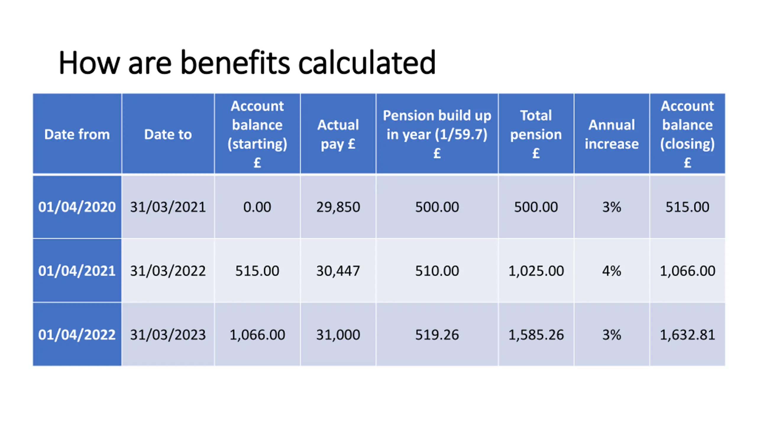 How are benefits calculated How are benefits calculated Account balance (starting) Account balance (closing) Pension build up in year (1/59.7) Total pension Actual pay Annual increase Date from Date to 01/04/2020 31/03/2021 0.00 29,850 500.00 500.00 3% 515.00 01/04/2021 31/03/2022 515.00 30,447 510.00 1,025.00 4% 1,066.00 01/04/2022 31/03/2023 1,066.00 31,000 519.26 1,585.26 3% 1,632.81