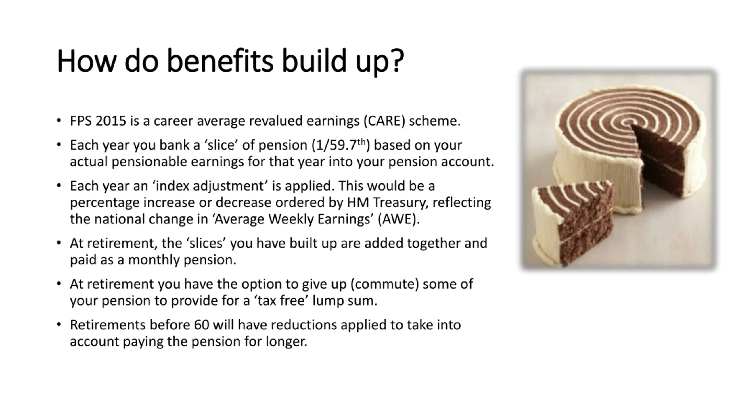 How do benefits build up? How do benefits build up? FPS 2015 is a career average revalued earnings (CARE) scheme. Each year you bank a slice of pension (1/59.7th) based on your actual pensionable earnings for that year into your pension account. Each year an index adjustment is applied. This would be a percentage increase or decrease ordered by HM Treasury, reflecting the national change in Average Weekly Earnings (AWE). At retirement, the slices you have built up are added together and paid as a monthly pension. At retirement you have the option to give up (commute) some of your pension to provide for a tax free lump sum. Retirements before 60 will have reductions applied to take into account paying the pension for longer.