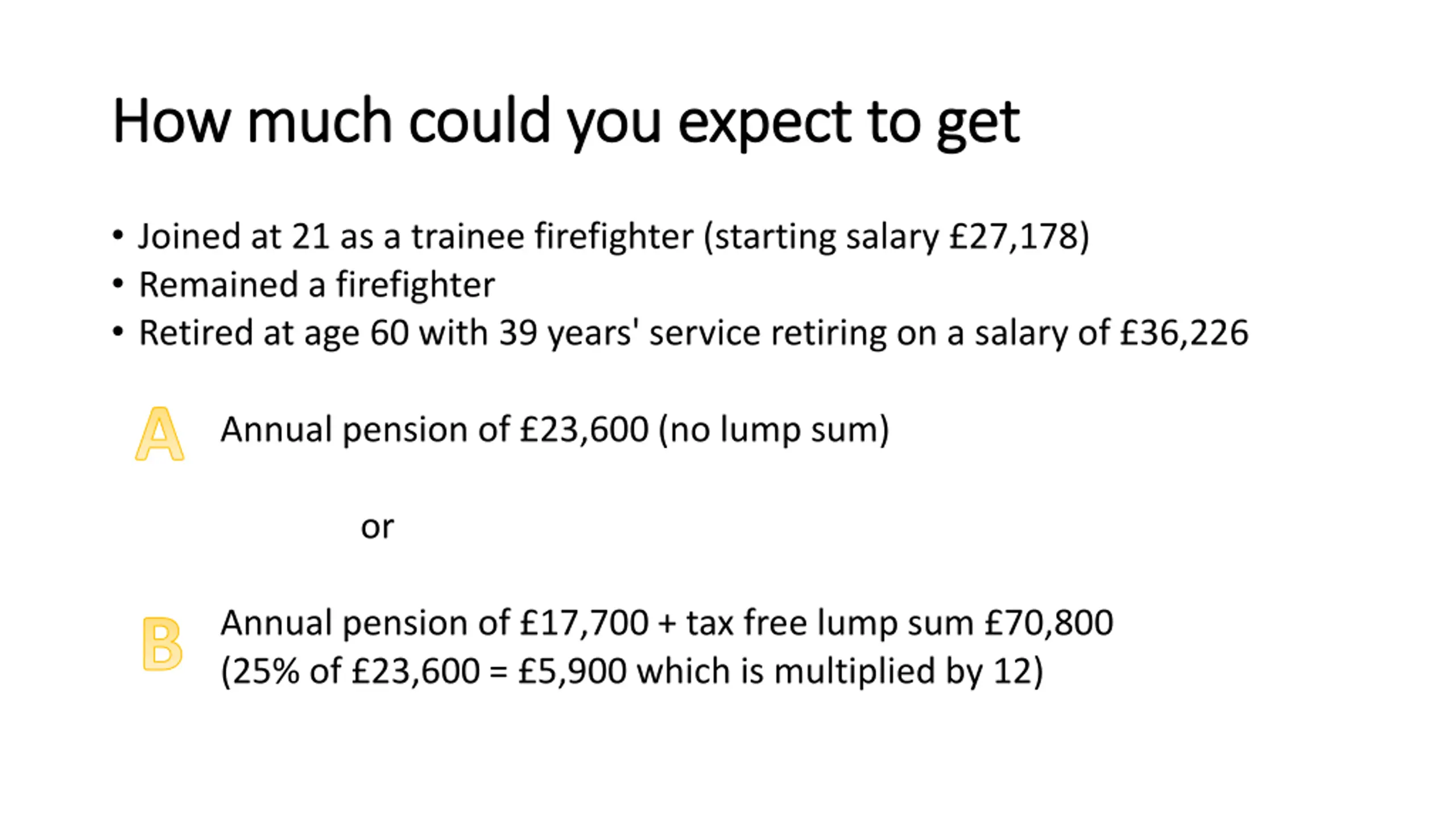 How much could you expect to get How much could you expect to get Joined at 21 as a trainee firefighter (starting salary 27,178) Remained a firefighter Retired at age 60 with 39 years' service retiring on a salary of 36,226 A Annual pension of 23,600 (no lump sum) or Annual pension of 17,700 + tax free lump sum 70,800 (25% of 23,600 = 5,900 which is multiplied by 12) B