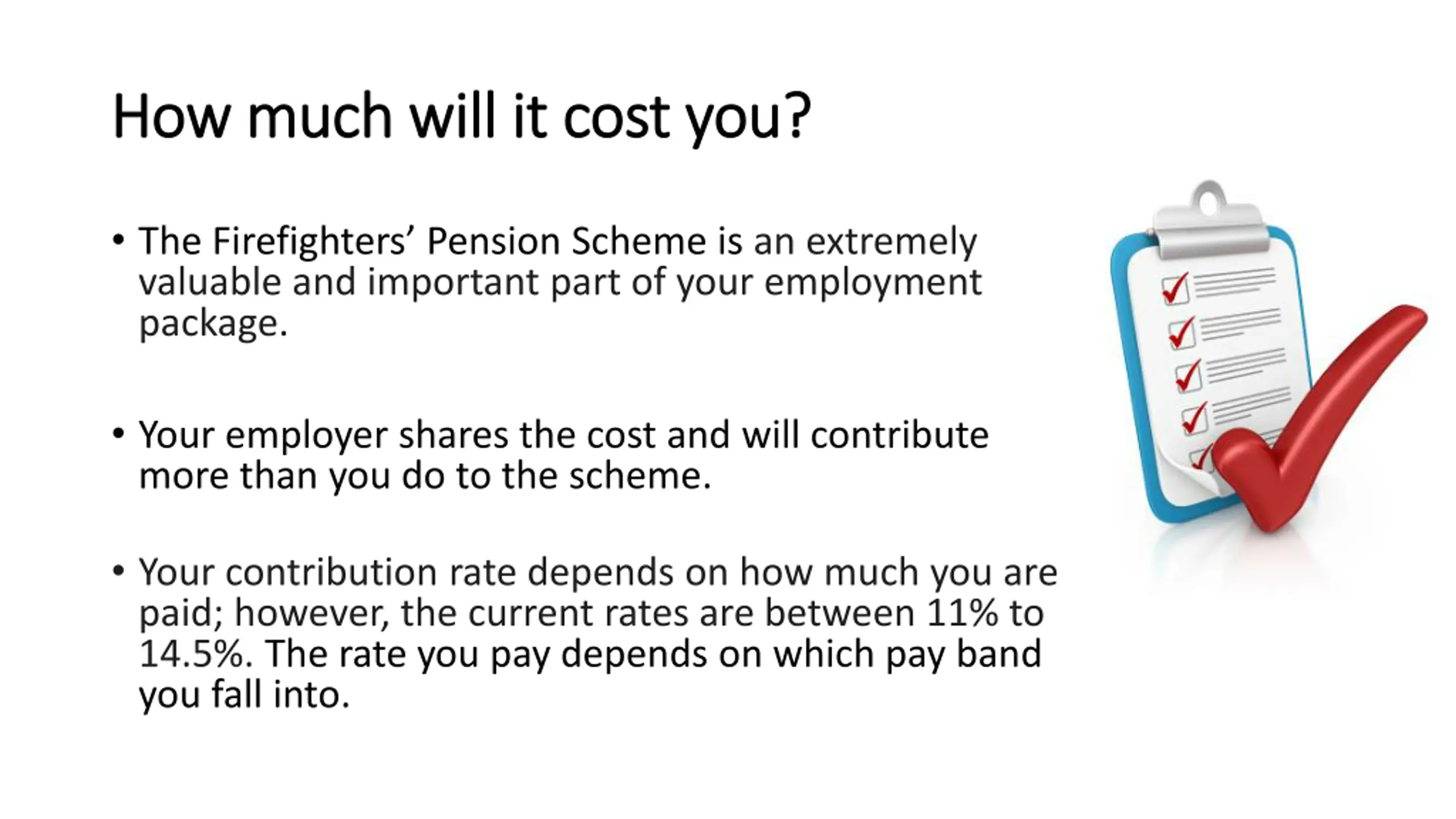 How much will it cost you? How much will it cost you? The Firefighters Pension Scheme is an extremely valuable and important part of your employment package. Your employer shares the cost and will contribute more than you do to the scheme. Your contribution rate depends on how much you are paid; however, the current rates are between 11% to 14.5%. The rate you pay depends on which pay band you fall into.