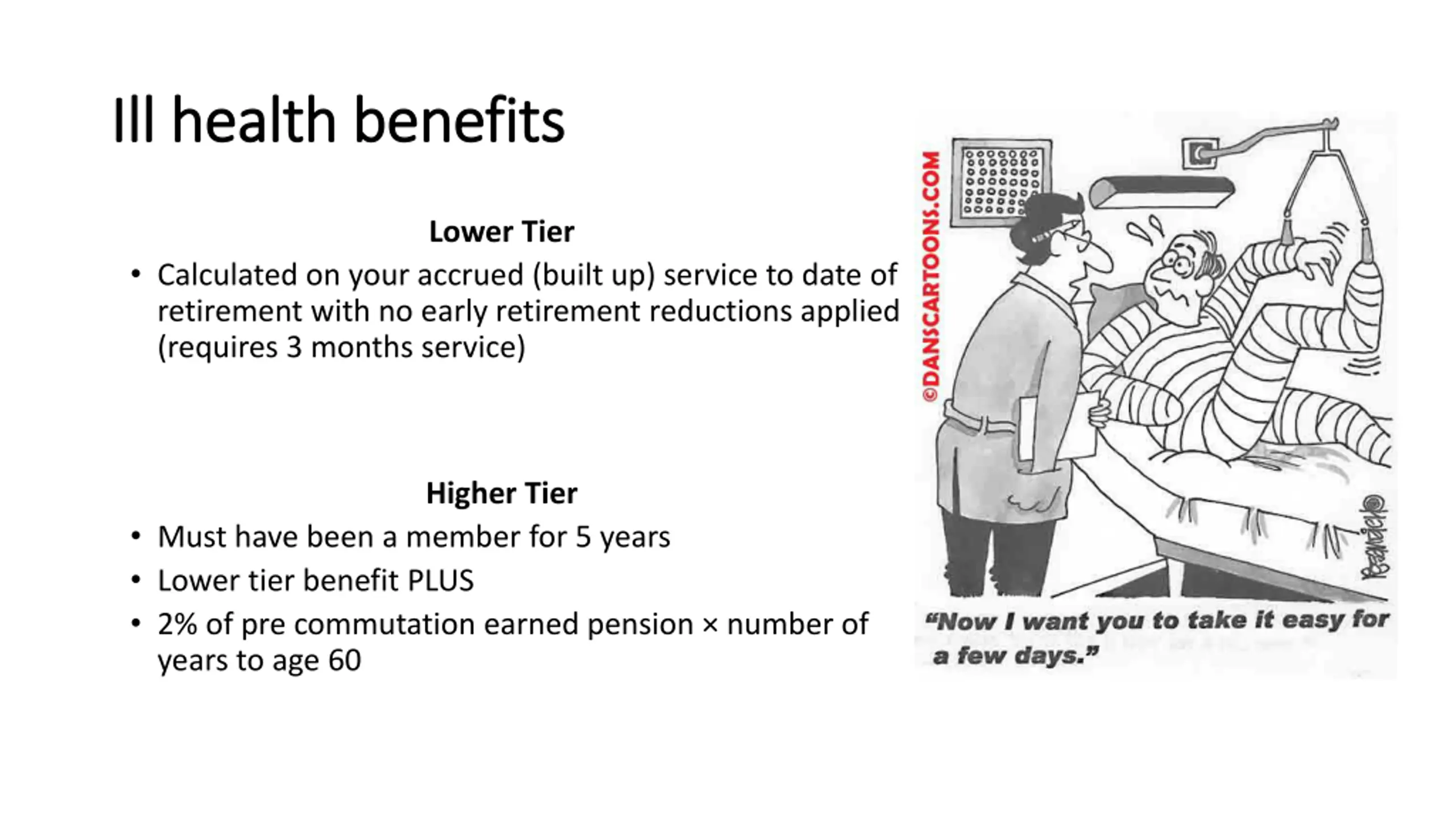 Ill health benefits Ill health benefits Lower Tier Calculated on your accrued (built up) service to date of retirement with no early retirement reductions applied (requires 3 months service) Higher Tier Must have been a member for 5 years Lower tier benefit PLUS 2% of pre commutation earned pension number of years to age 60