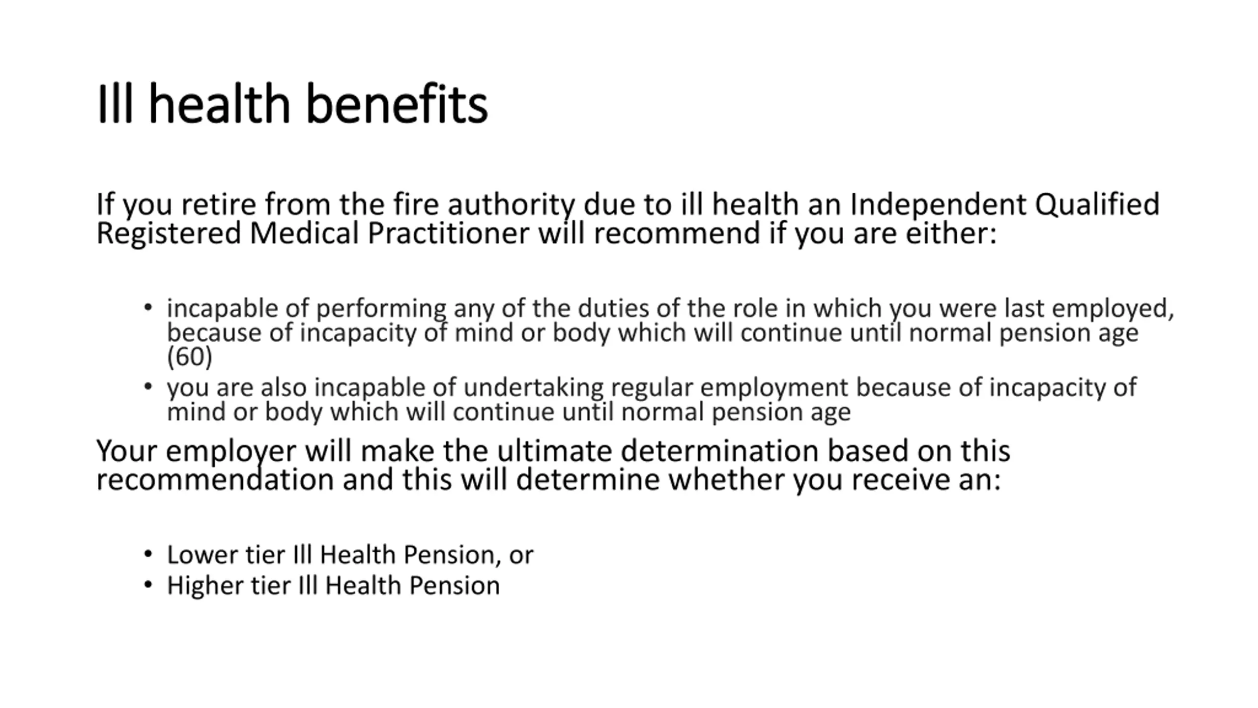 Ill health benefits Ill health benefits If you retire from the fire authority due to ill health an Independent Qualified Registered Medical Practitioner will recommend if you are either: incapable of performing any of the duties of the role in which you were last employed, because of incapacity of mind or body which will continue until normal pension age (60) you are also incapable of undertaking regular employment because of incapacity of mind or body which will continue until normal pension age Your employer will make the ultimate determination based on this recommendation and this will determine whether you receive an: Lower tier Ill Health Pension, or Higher tier Ill Health Pension