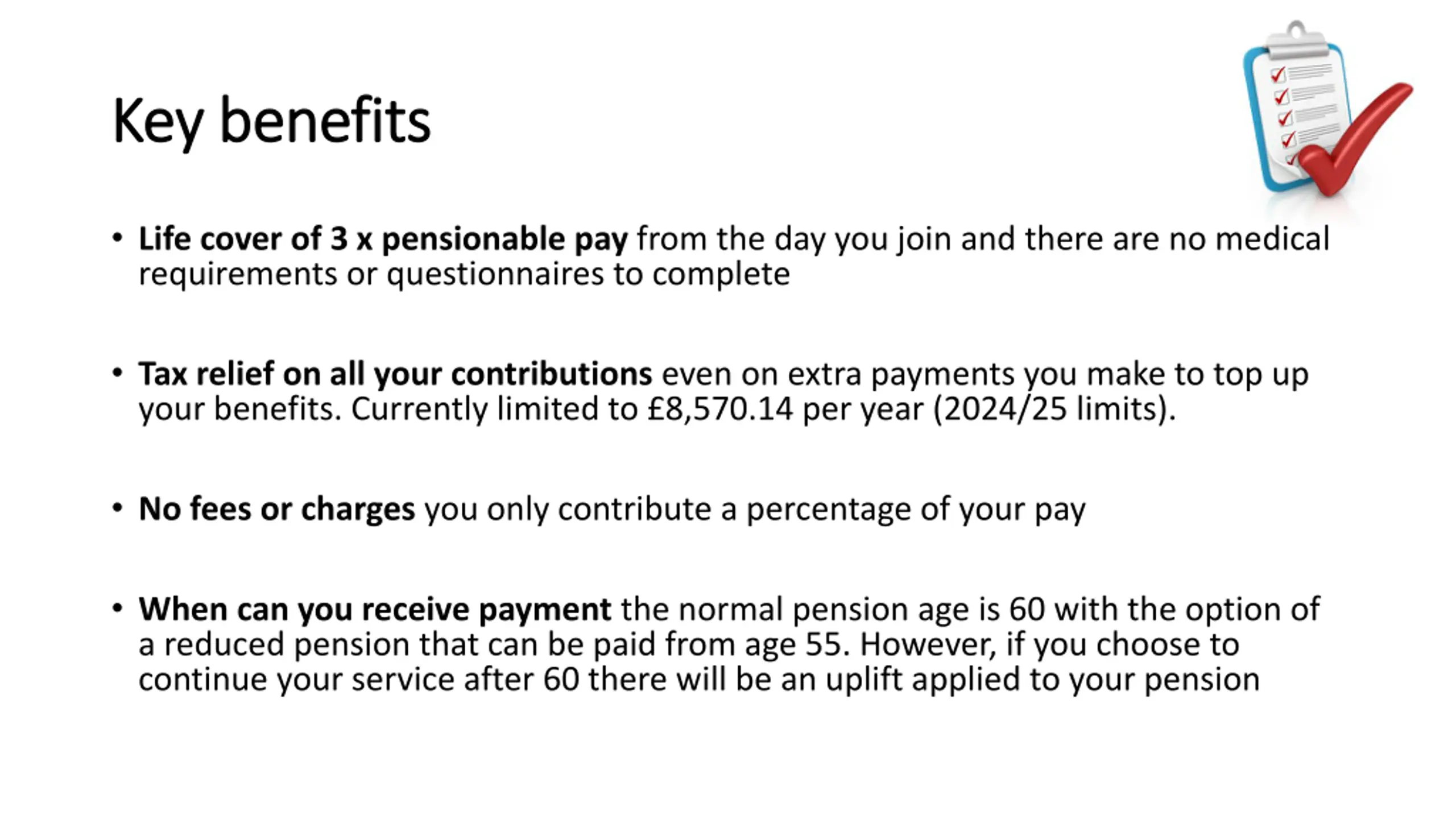 Key benefits Key benefits Life cover of 3 x pensionable pay from the day you join and there are no medical requirements or questionnaires to complete Tax relief on all your contributions even on extra payments you make to top up your benefits. Currently limited to 8,570.14 per year (2024/25 limits). No fees or charges you only contribute a percentage of your pay When can you receive payment the normal pension age is 60 with the option of a reduced pension that can be paid from age 55. However, if you choose to continue your service after 60 there will be an uplift applied to your pension