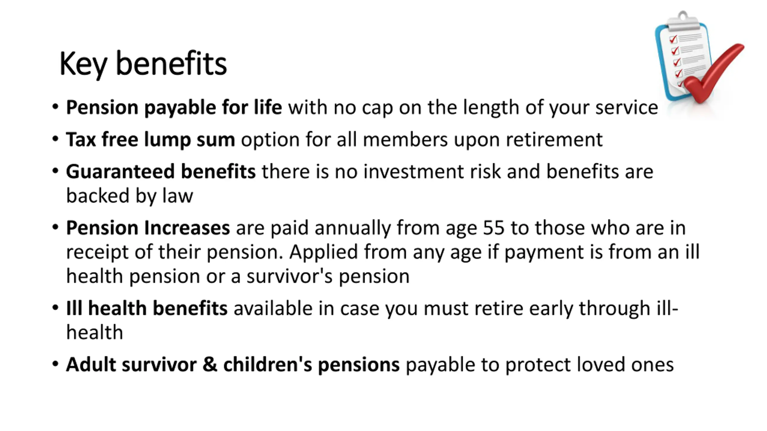 Key benefits Key benefits Pension payable for life with no cap on the length of your service Tax free lump sum option for all members upon retirement Guaranteed benefits there is no investment risk and benefits are backed by law Pension Increases are paid annually from age 55 to those who are in receipt of their pension. Applied from any age if payment is from an ill health pension or a survivor's pension Ill health benefits available in case you must retire early through ill- health Adult survivor & children's pensions payable to protect loved ones
