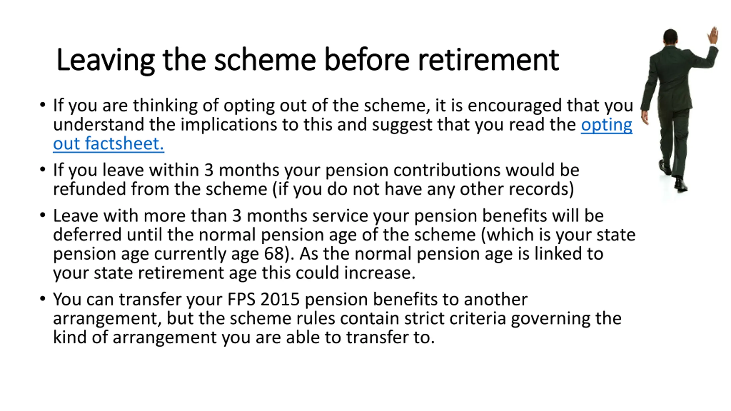 Leaving the scheme before retirement Leaving the scheme before retirement If you are thinking of opting out of the scheme, it is encouraged that you understand the implications to this and suggest that you read the opting out factsheet. If you leave within 3 months your pension contributions would be refunded from the scheme (if you do not have any other records) Leave with more than 3 months service your pension benefits will be deferred until the normal pension age of the scheme (which is your state pension age currently age 68). As the normal pension age is linked to your state retirement age this could increase. You can transfer your FPS 2015 pension benefits to another arrangement, but the scheme rules contain strict criteria governing the kind of arrangement you are able to transfer to.