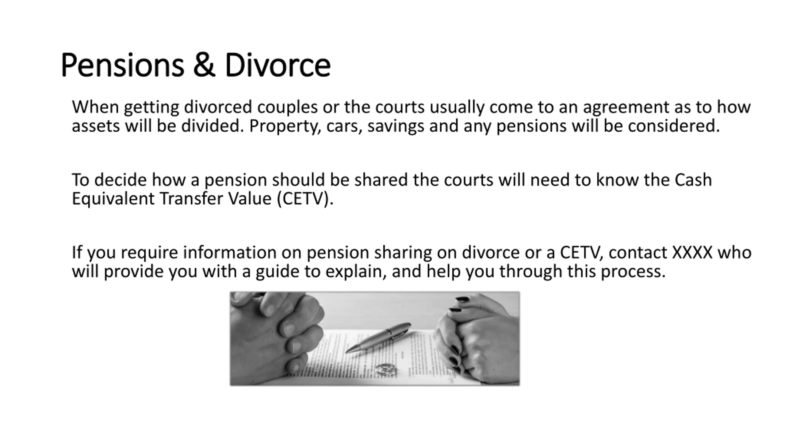 Pensions & Divorce Pensions & Divorce When getting divorced couples or the courts usually come to an agreement as to how assets will be divided. Property, cars, savings and any pensions will be considered. To decide how a pension should be shared the courts will need to know the Cash Equivalent Transfer Value (CETV). If you require information on pension sharing on divorce or a CETV, contact XXXX who will provide you with a guide to explain, and help you through this process.