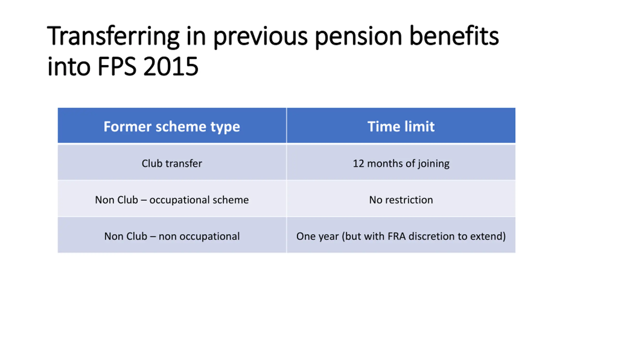Transferring in previous pension benefits Transferring in previous pension benefits into FPS 2015 into FPS 2015 Former scheme type Time limit Club transfer 12 months of joining Non Club occupational scheme No restriction Non Club non occupational One year (but with FRA discretion to extend)