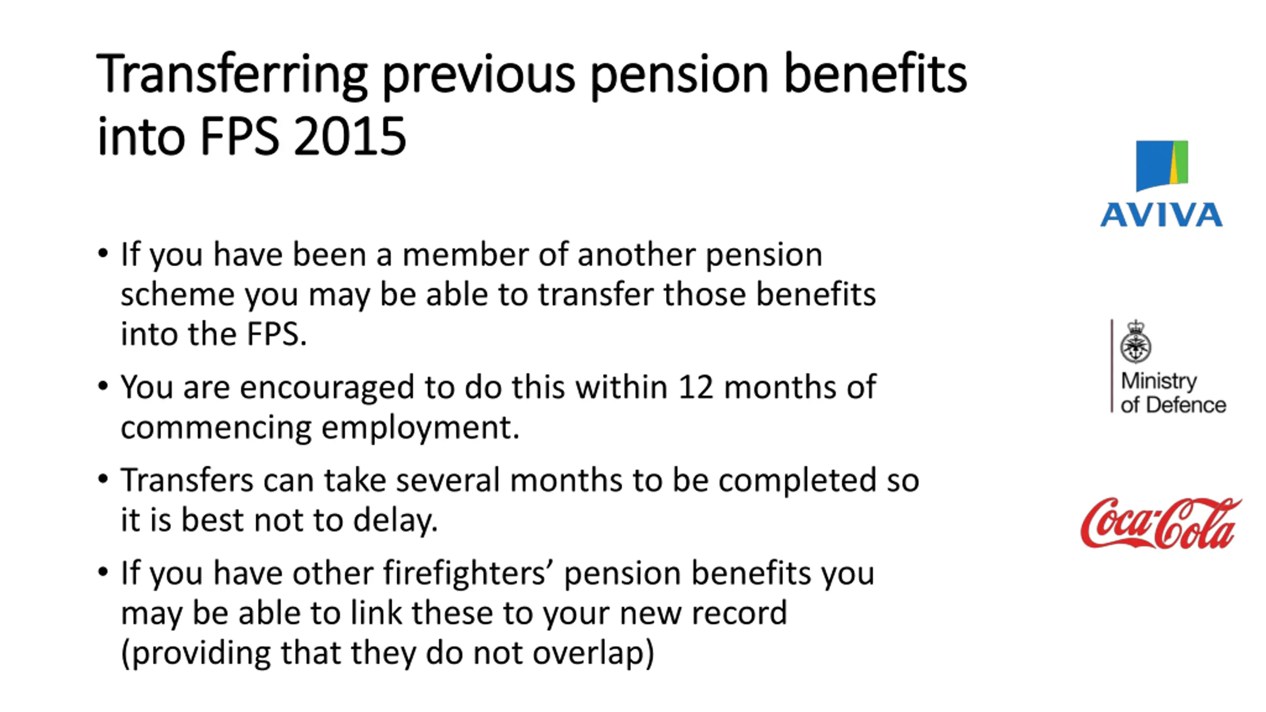 Transferring previous pension benefits Transferring previous pension benefits into FPS 2015 into FPS 2015 If you have been a member of another pension scheme you may be able to transfer those benefits into the FPS. You are encouraged to do this within 12 months of commencing employment. Transfers can take several months to be completed so it is best not to delay. If you have other firefighters pension benefits you may be able to link these to your new record (providing that they do not overlap)