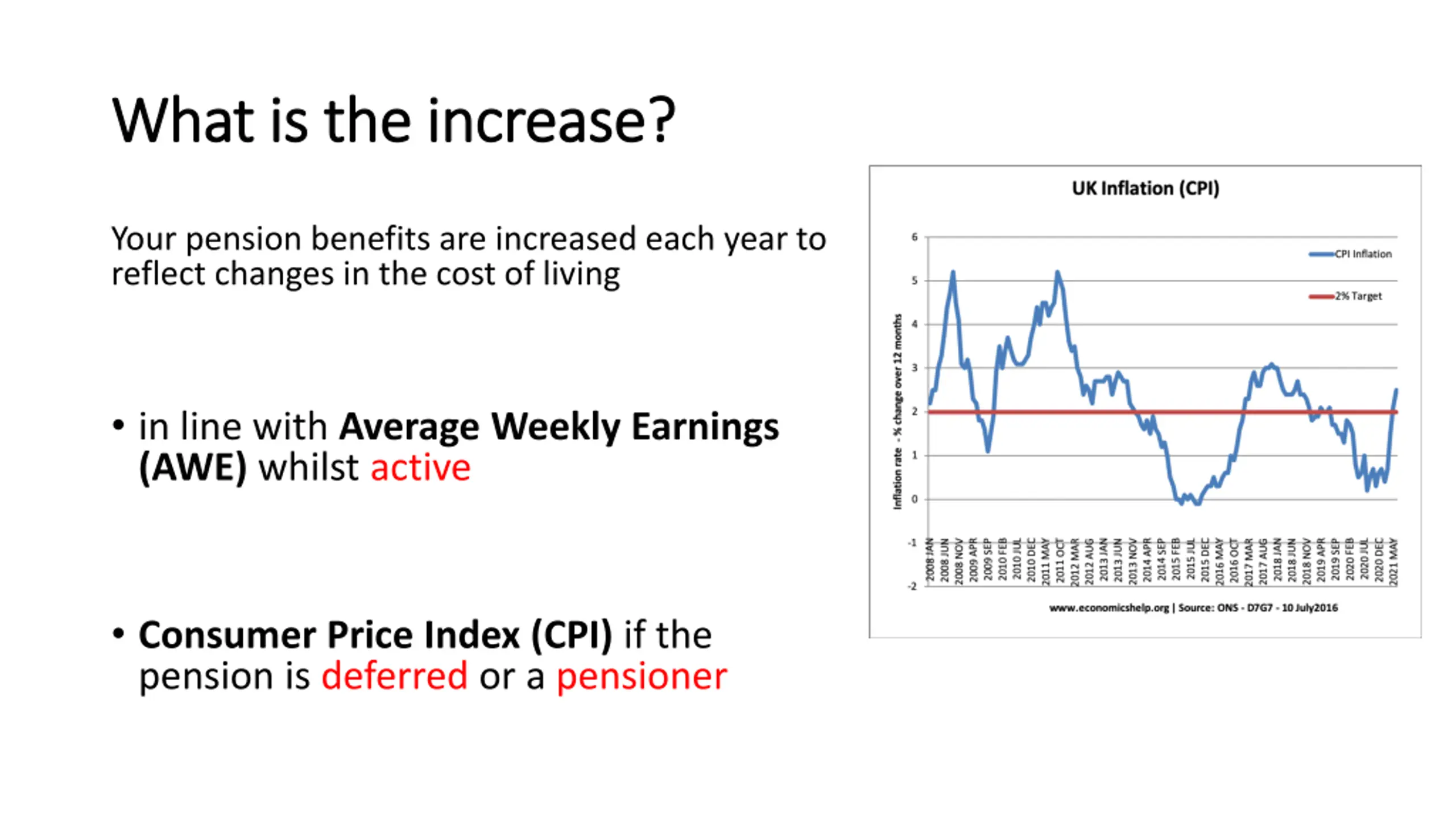 What is the increase? What is the increase? Your pension benefits are increased each year to reflect changes in the cost of living in line with Average Weekly Earnings (AWE) whilst active Consumer Price Index (CPI) if the pension is deferred or a pensioner