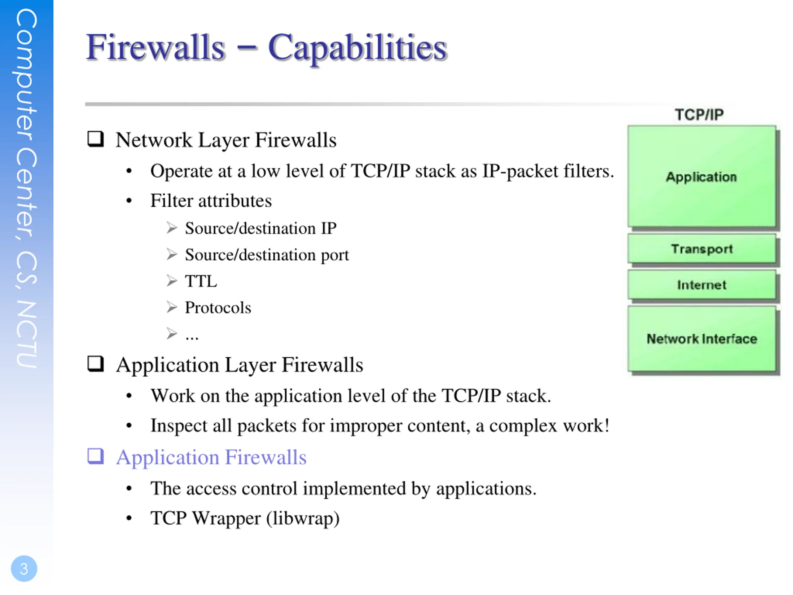 Computer Center, CS, NCTU Firewalls Capabilities Network Layer Firewalls Operate at a low level of TCP/IP stack as IP-packet filters. Filter attributes Source/destination IP Source/destination port TTL Protocols Application Layer Firewalls Work on the application level of the TCP/IP stack. Inspect all packets for improper content, a complex work! Application Firewalls The access control implemented by applications. TCP Wrapper (libwrap) 3