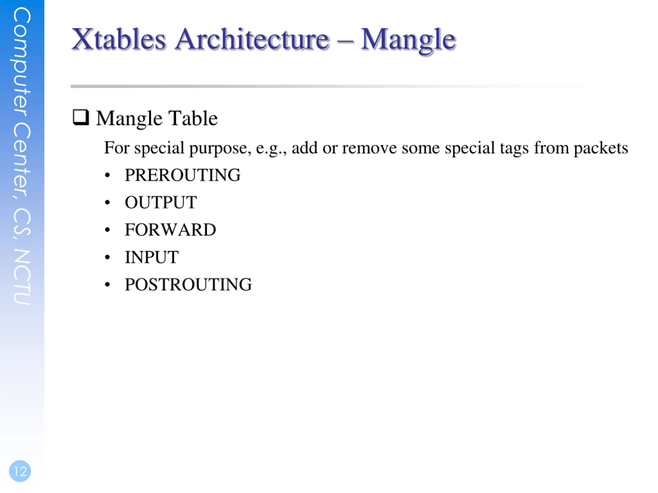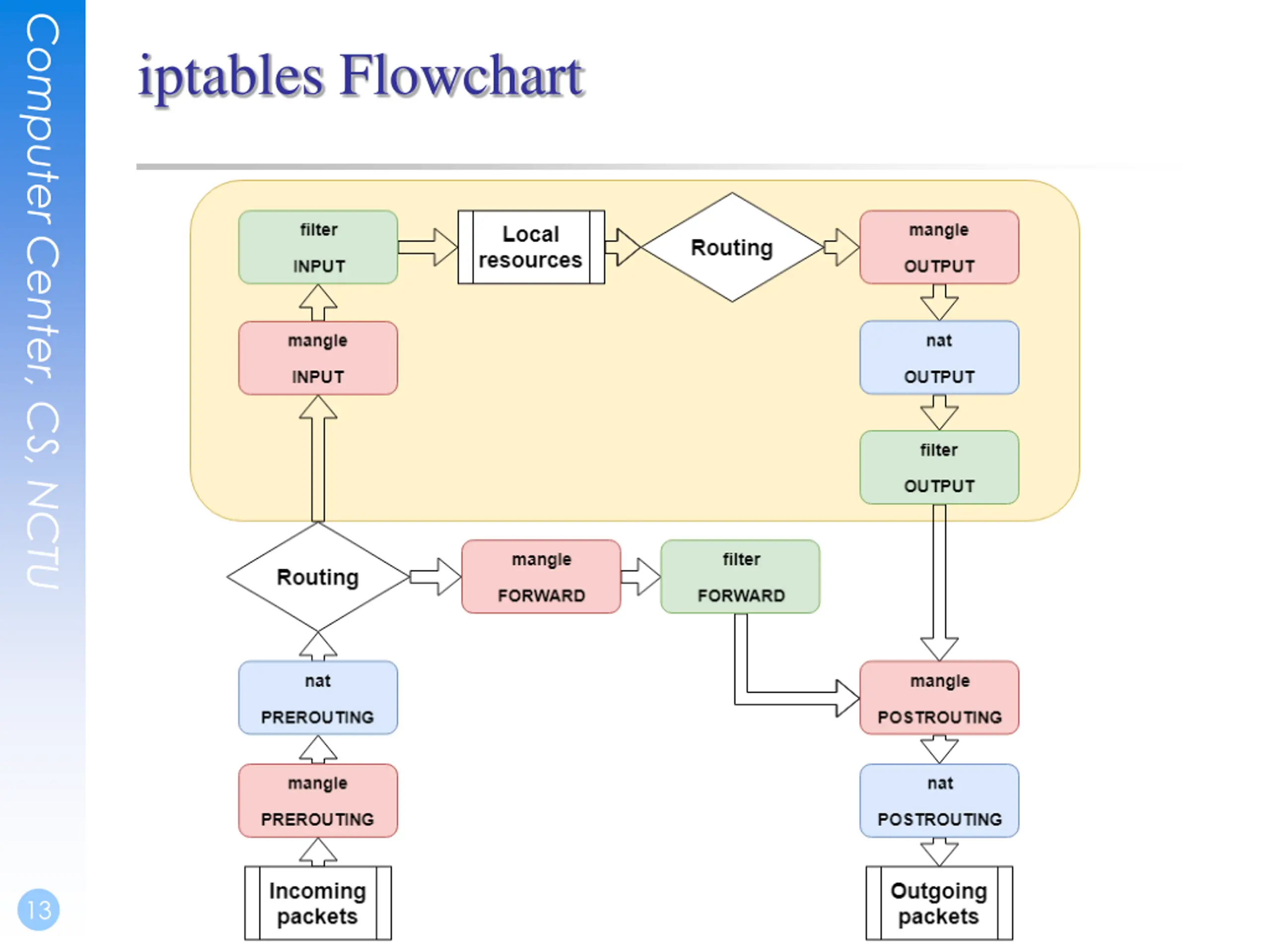 Computer Center, CS, NCTU Xtables Architecture Mangle Mangle Table For special purpose, e.g., add or remove some special tags from packets PREROUTING OUTPUT FORWARD INPUT POSTROUTING 12