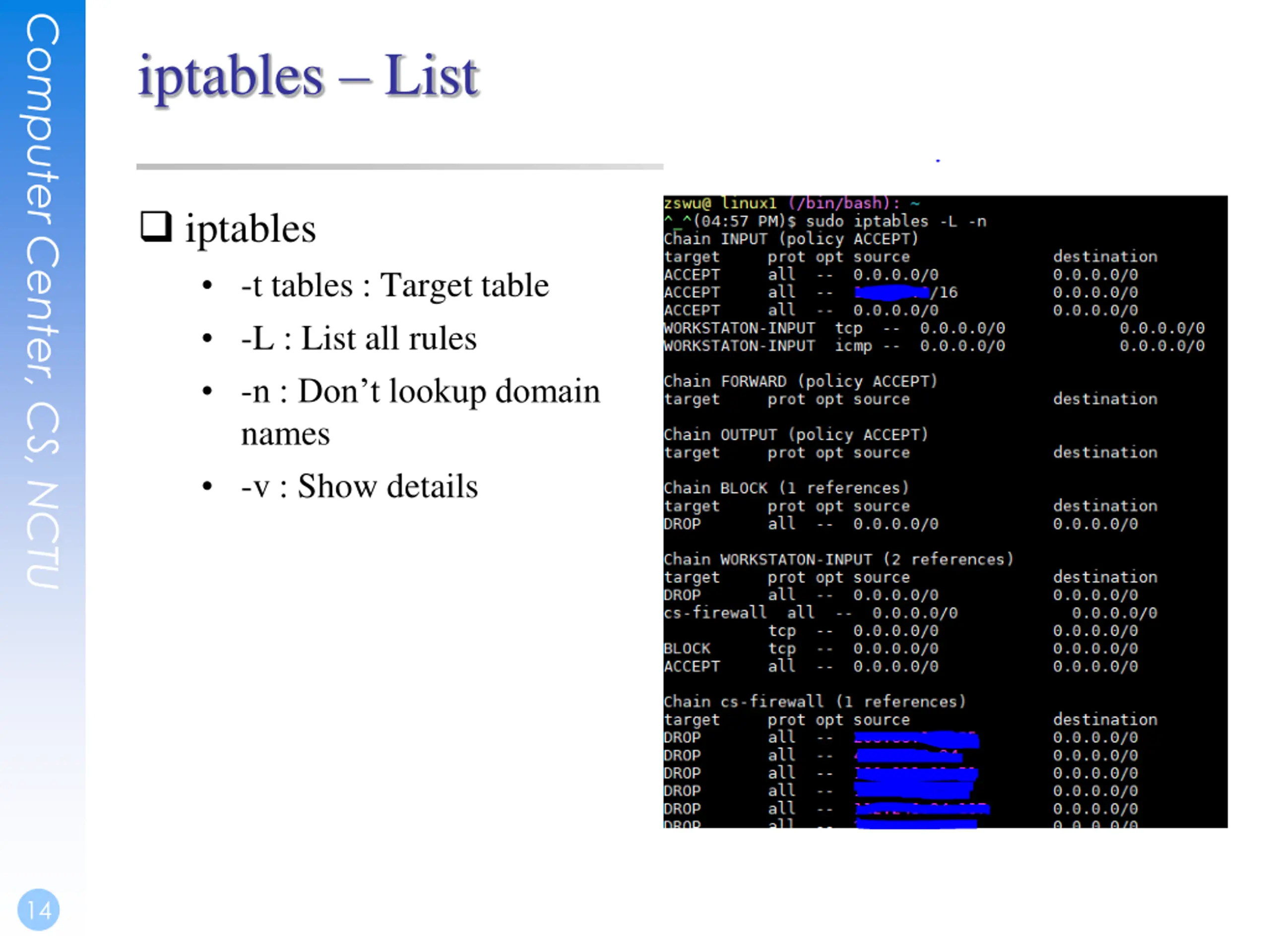 Computer Center, CS, NCTU iptables List iptables -t tables : Target table -L : List all rules -n : Don t lookup domain names -v : Show details 14