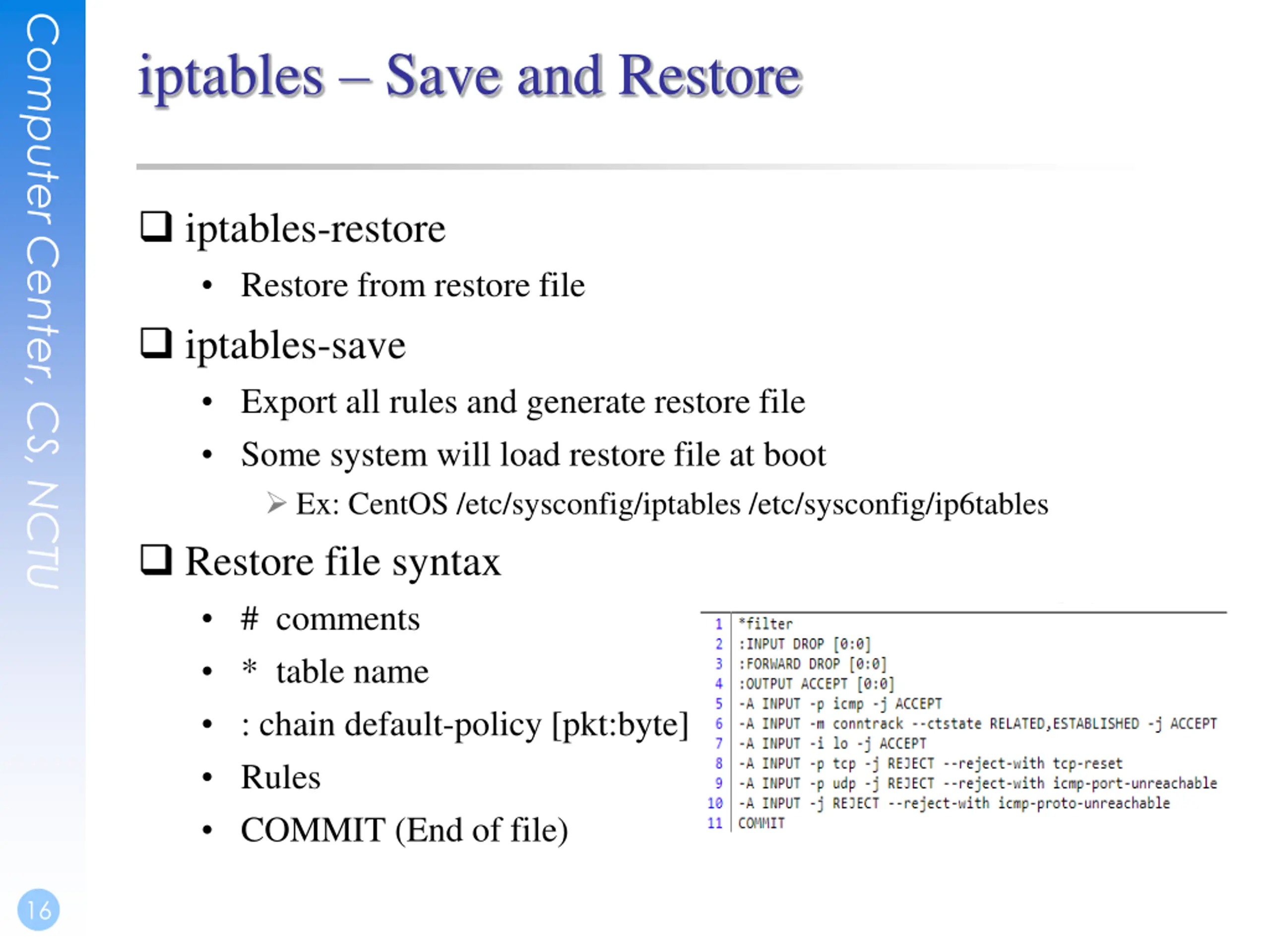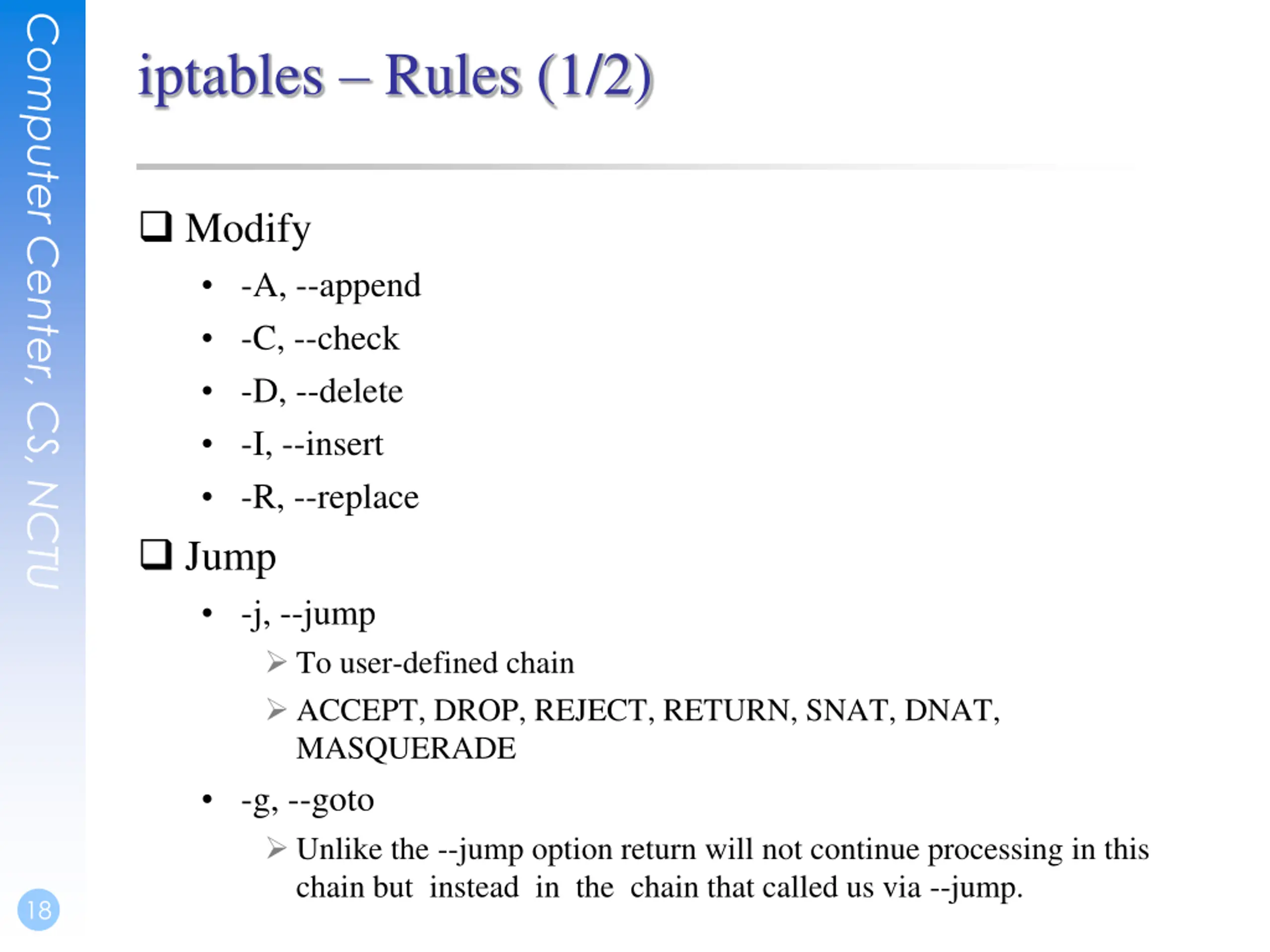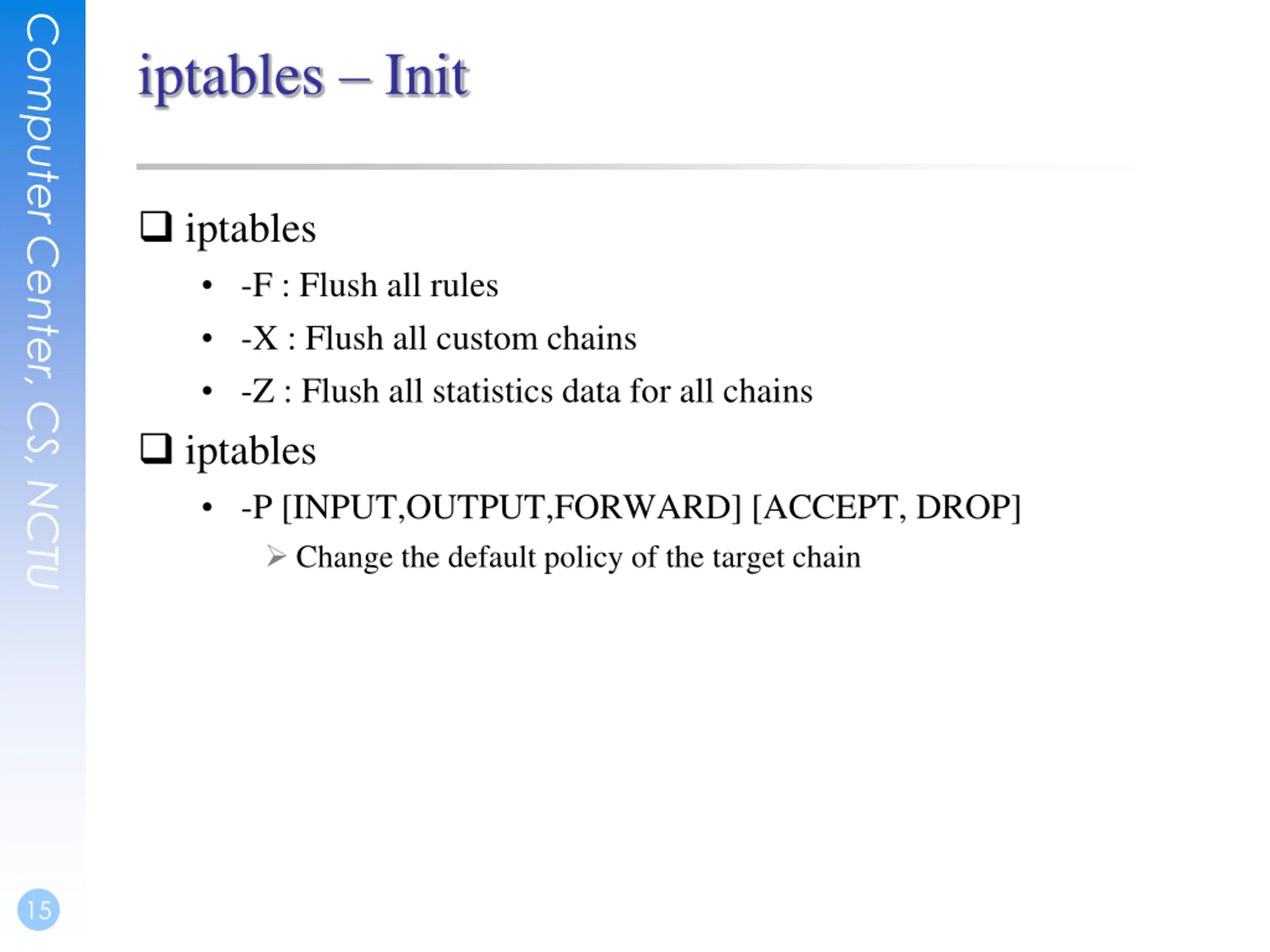 Computer Center, CS, NCTU iptables Init iptables -F : Flush all rules -X : Flush all custom chains -Z : Flush all statistics data for all chains iptables -P [INPUT,OUTPUT,FORWARD] [ACCEPT, DROP] Change the default policy of the target chain 15