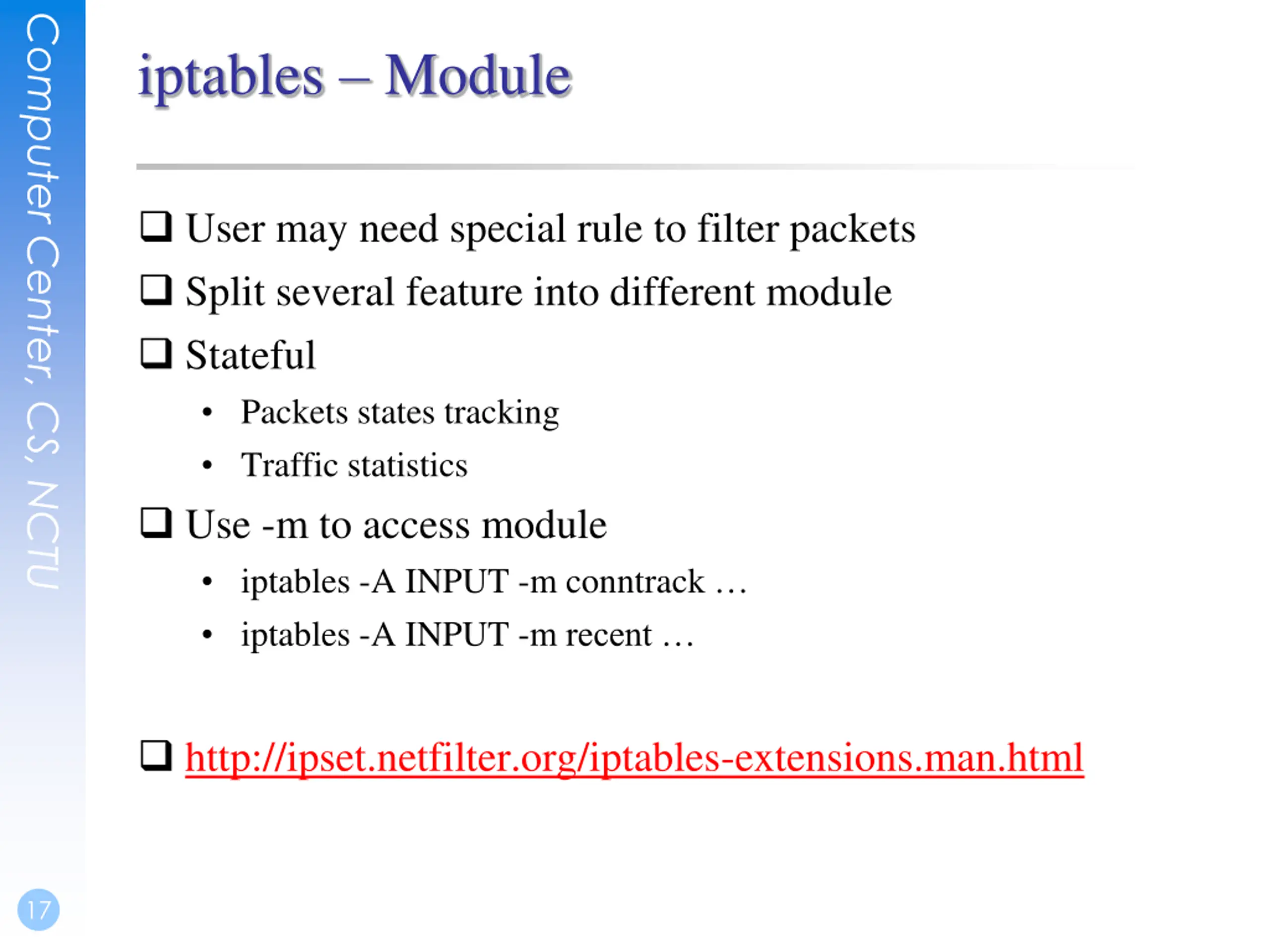 Computer Center, CS, NCTU iptables Module User may need special rule to filter packets Split several feature into different module Stateful Packets states tracking Traffic statistics Use -m to access module iptables -A INPUT -m conntrack iptables -A INPUT -m recent http://ipset.netfilter.org/iptables-extensions.man.html 17