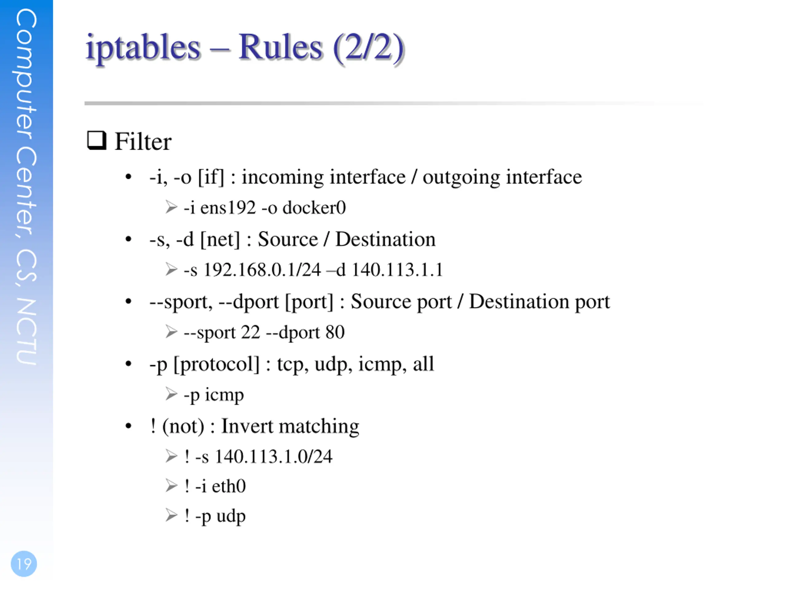 Computer Center, CS, NCTU iptables Rules (2/2) Filter -i, -o [if] : incoming interface / outgoing interface -i ens192 -o docker0 -s, -d [net] : Source / Destination -s 192.168.0.1/24 d 140.113.1.1 --sport, --dport [port] : Source port / Destination port --sport 22 --dport 80 -p [protocol] : tcp, udp, icmp, all -p icmp ! (not) : Invert matching ! -s 140.113.1.0/24 ! -i eth0 ! -p udp 19