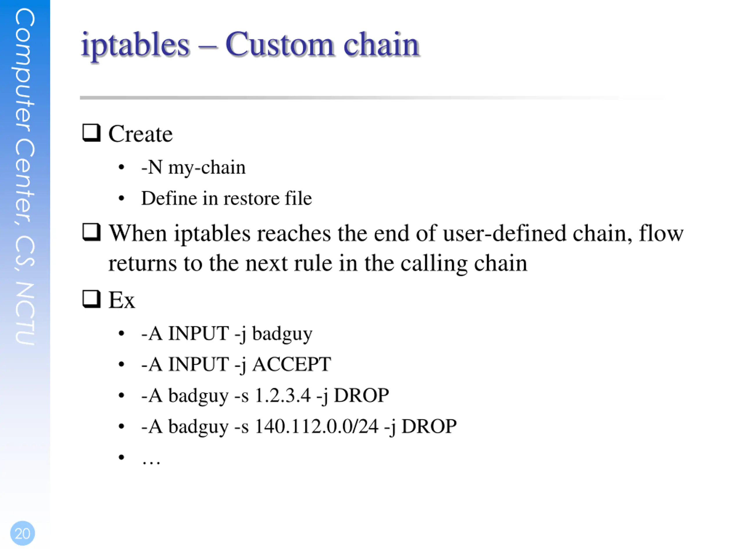 Computer Center, CS, NCTU iptables Custom chain Create -N my-chain Define in restore file When iptables reaches the end of user-defined chain, flow returns to the next rule in the calling chain Ex -A INPUT -j badguy -A INPUT -j ACCEPT -A badguy -s 1.2.3.4 -j DROP -A badguy -s 140.112.0.0/24 -j DROP 20