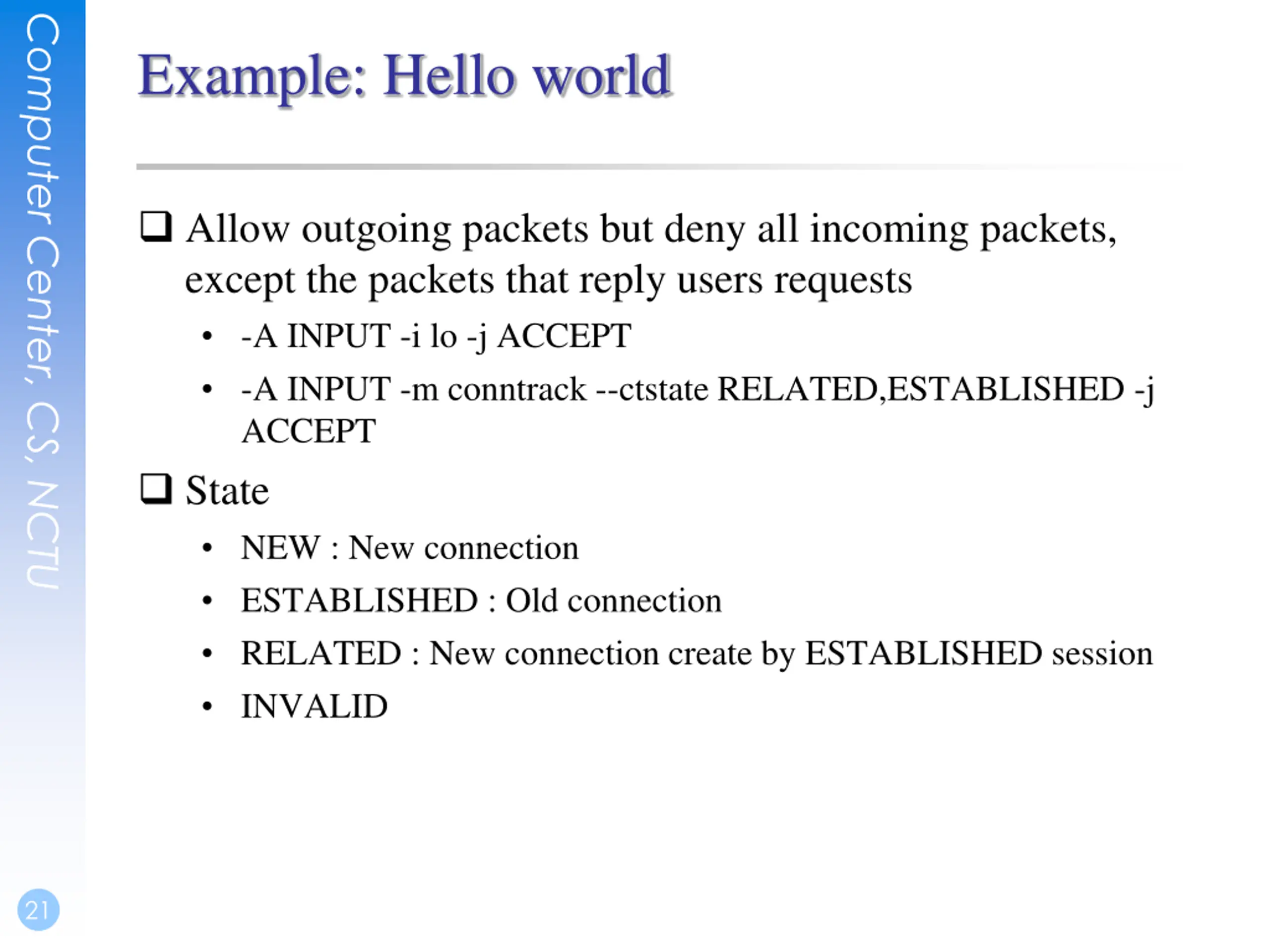 Computer Center, CS, NCTU Example: Hello world Allow outgoing packets but deny all incoming packets, except the packets that reply users requests -A INPUT -i lo -j ACCEPT -A INPUT -m conntrack --ctstate RELATED,ESTABLISHED -j ACCEPT State NEW : New connection ESTABLISHED : Old connection RELATED : New connection create by ESTABLISHED session INVALID 21