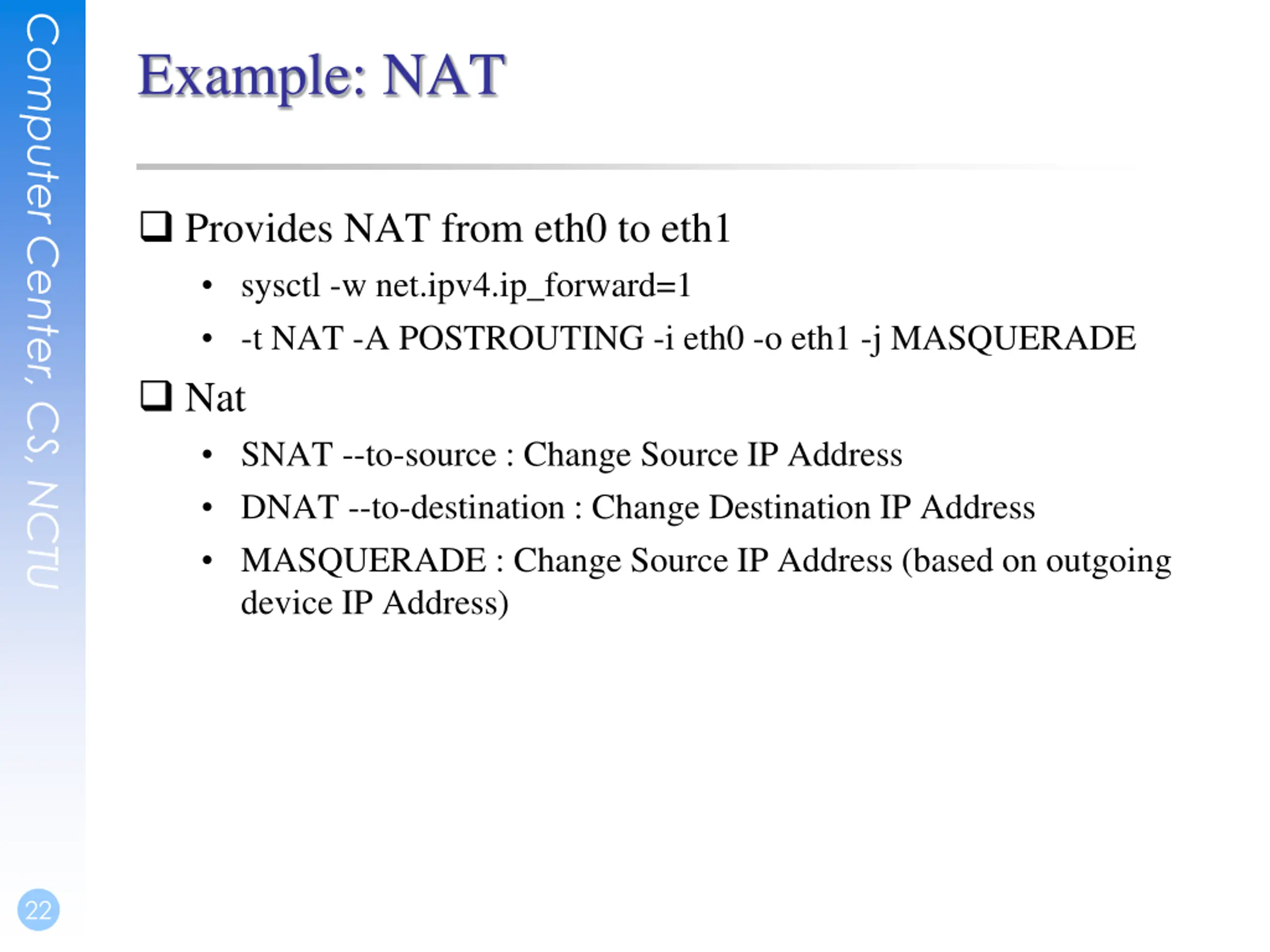 Computer Center, CS, NCTU Example: NAT Provides NAT from eth0 to eth1 sysctl -w net.ipv4.ip_forward=1 -t NAT -A POSTROUTING -i eth0 -o eth1 -j MASQUERADE Nat SNAT --to-source : Change Source IP Address DNAT --to-destination : Change Destination IP Address MASQUERADE : Change Source IP Address (based on outgoing device IP Address) 22