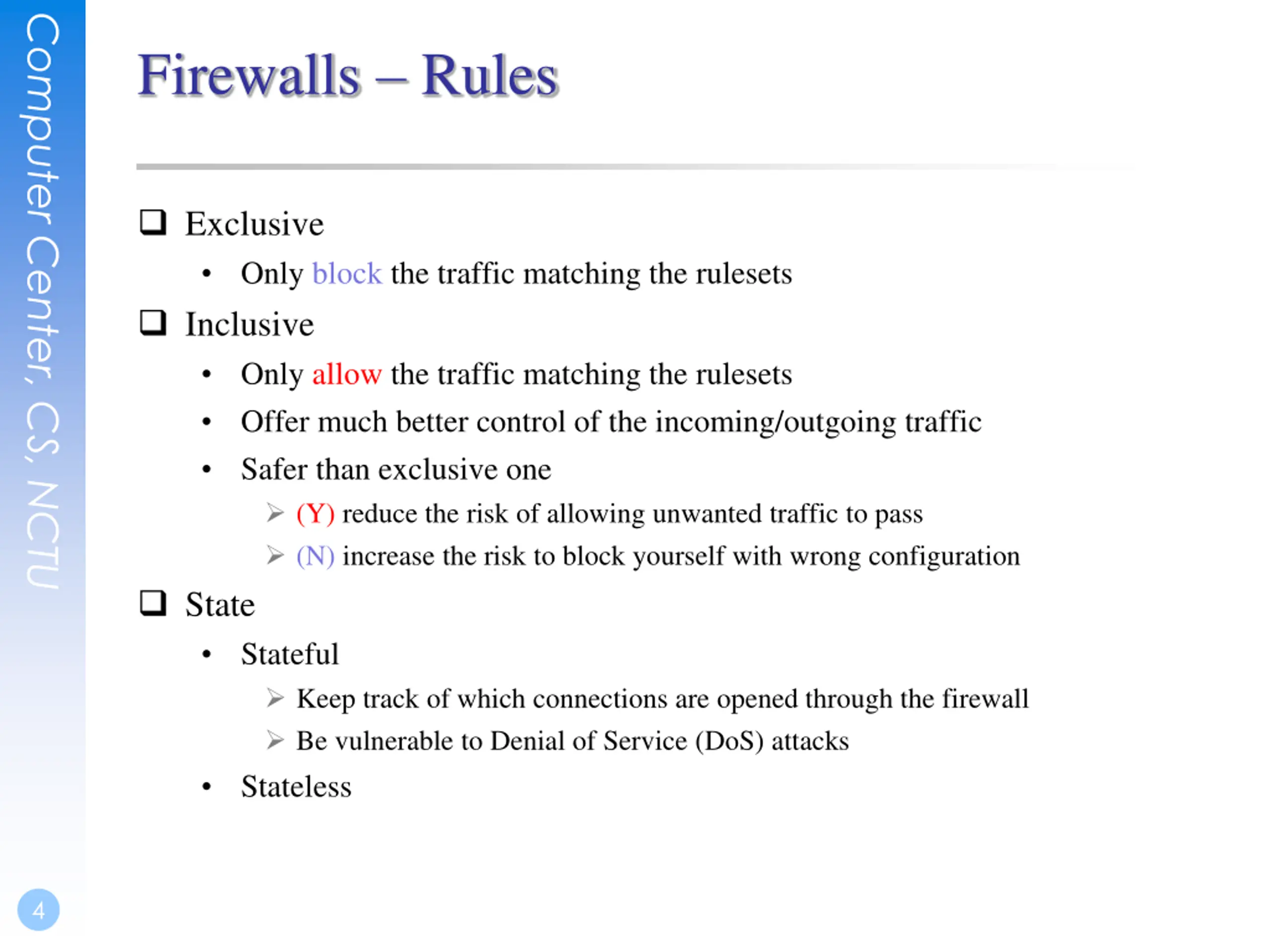 Computer Center, CS, NCTU Firewalls Rules Exclusive Inclusive Only block the traffic matching the rulesets Only allow the traffic matching the rulesets Offer much better control of the incoming/outgoing traffic Safer than exclusive one (Y) reduce the risk of allowing unwanted traffic to pass (N) increase the risk to block yourself with wrong configuration State Stateful Keep track of which connections are opened through the firewall Be vulnerable to Denial of Service (DoS) attacks Stateless 4