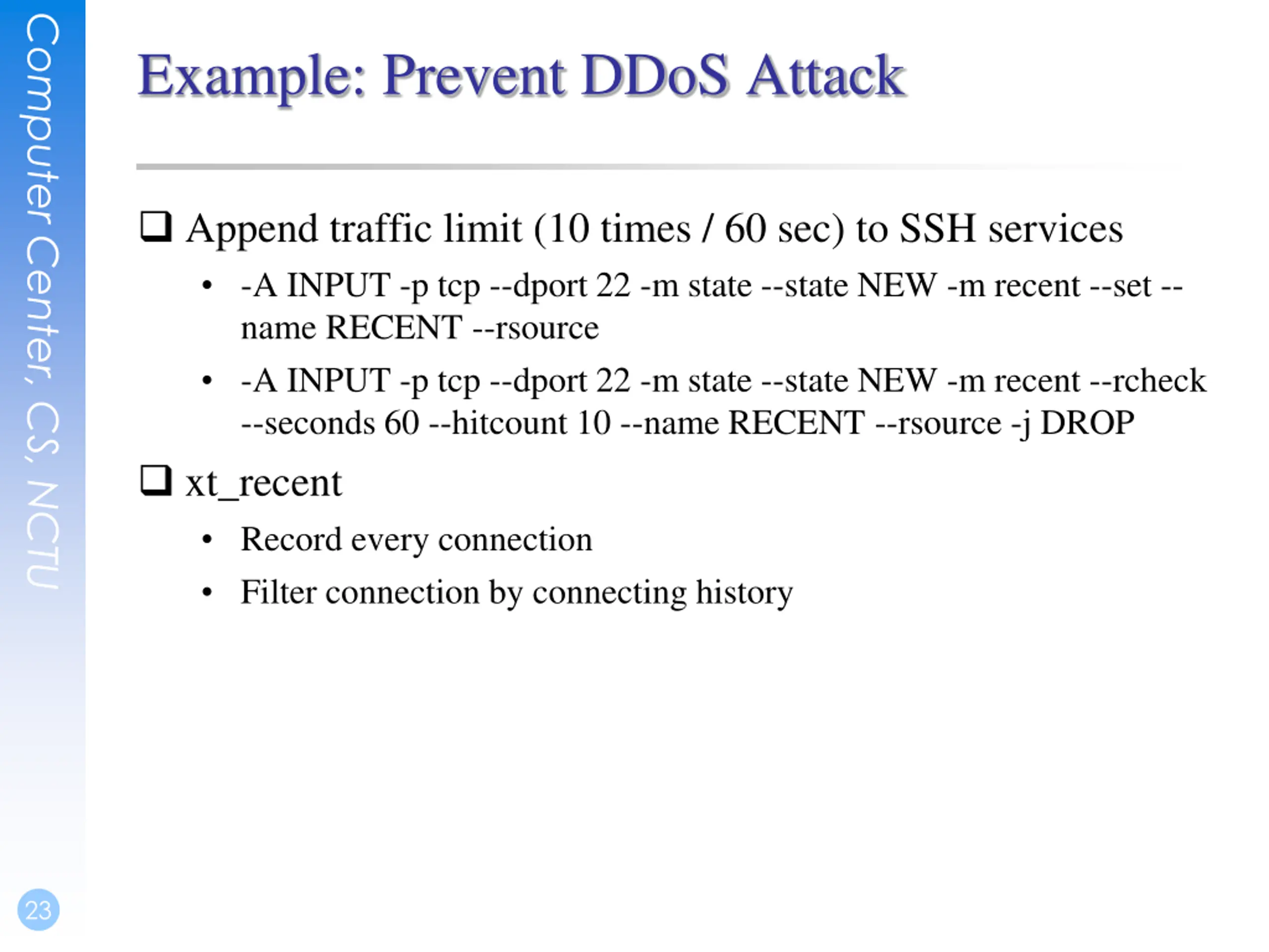Computer Center, CS, NCTU Example: Prevent DDoS Attack Append traffic limit (10 times / 60 sec) to SSH services -A INPUT -p tcp --dport 22 -m state --state NEW -m recent --set -- name RECENT --rsource -A INPUT -p tcp --dport 22 -m state --state NEW -m recent --rcheck --seconds 60 --hitcount 10 --name RECENT --rsource -j DROP xt_recent Record every connection Filter connection by connecting history 23