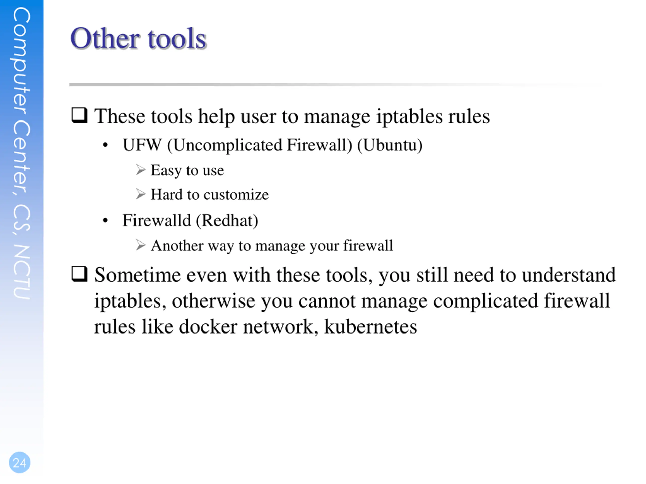Computer Center, CS, NCTU Other tools These tools help user to manage iptables rules UFW (Uncomplicated Firewall) (Ubuntu) Easy to use Hard to customize Firewalld (Redhat) Another way to manage your firewall Sometime even with these tools, you still need to understand iptables, otherwise you cannot manage complicated firewall rules like docker network, kubernetes 24