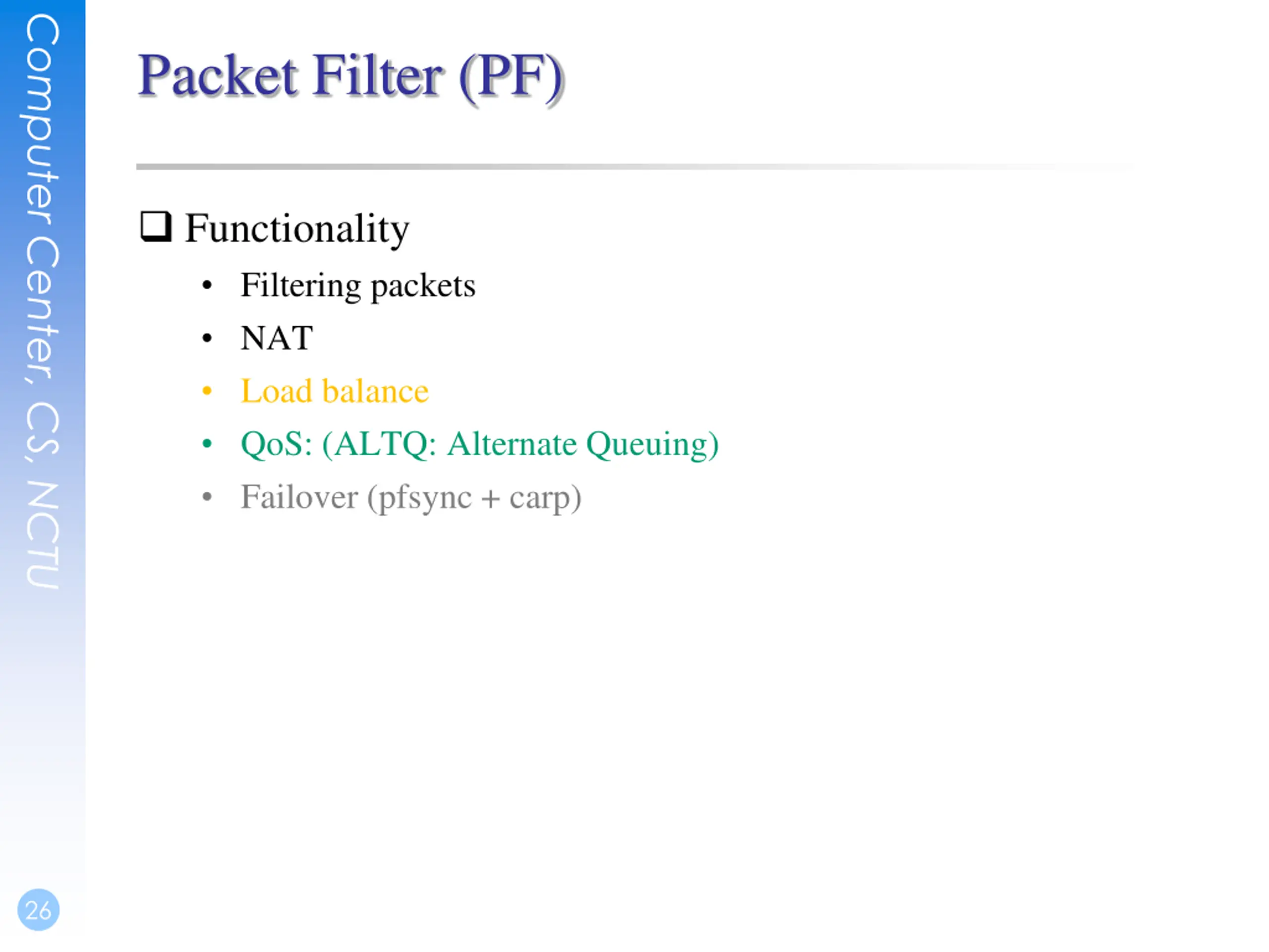 Computer Center, CS, NCTU Packet Filter (PF) Functionality Filtering packets NAT Load balance QoS: (ALTQ: Alternate Queuing) Failover (pfsync + carp) 26