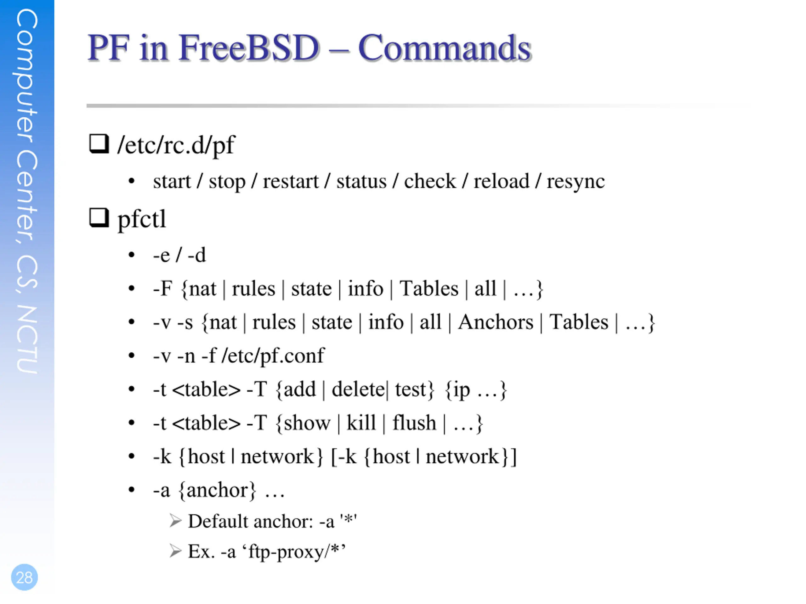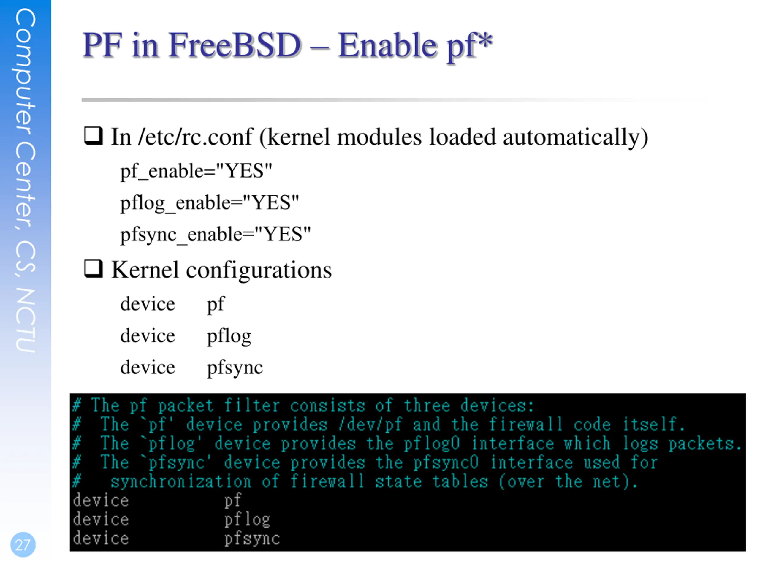 Computer Center, CS, NCTU PF in FreeBSD Enable pf* In /etc/rc.conf (kernel modules loaded automatically) pf_enable="YES" pflog_enable="YES" pfsync_enable="YES" Kernel configurations device pf device pflog device pfsync 27