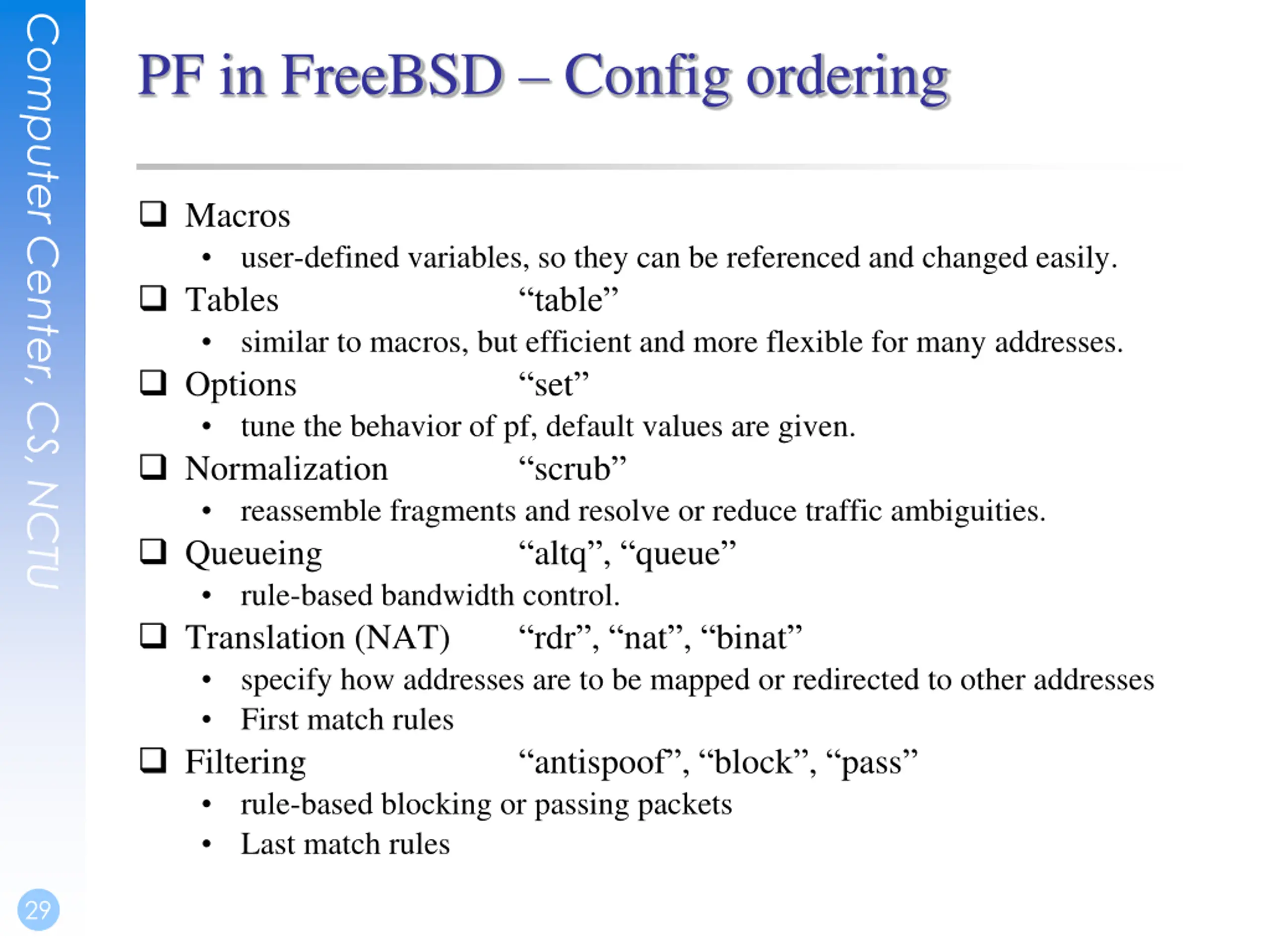 Computer Center, CS, NCTU PF in FreeBSD Config ordering Macros Tables Options Normalization reassemble fragments and resolve or reduce traffic ambiguities. Queueing altq , queue rule-based bandwidth control. Translation (NAT) rdr , nat , binat specify how addresses are to be mapped or redirected to other addresses First match rules Filtering antispoof , block , pass rule-based blocking or passing packets Last match rules user-defined variables, so they can be referenced and changed easily. table similar to macros, but efficient and more flexible for many addresses. set tune the behavior of pf, default values are given. scrub 29