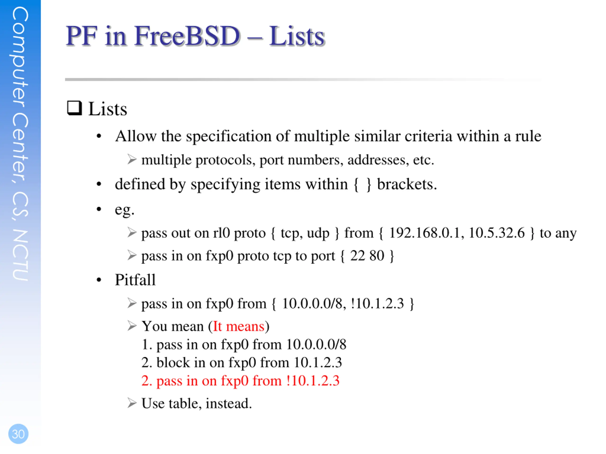 Computer Center, CS, NCTU PF in FreeBSD Lists Lists Allow the specification of multiple similar criteria within a rule multiple protocols, port numbers, addresses, etc. defined by specifying items within { } brackets. eg. pass out on rl0 proto { tcp, udp } from { 192.168.0.1, 10.5.32.6 } to any pass in on fxp0 proto tcp to port { 22 80 } Pitfall pass in on fxp0 from { 10.0.0.0/8, !10.1.2.3 } You mean (It means) 1. pass in on fxp0 from 10.0.0.0/8 2. block in on fxp0 from 10.1.2.3 2. pass in on fxp0 from !10.1.2.3 Use table, instead. 30