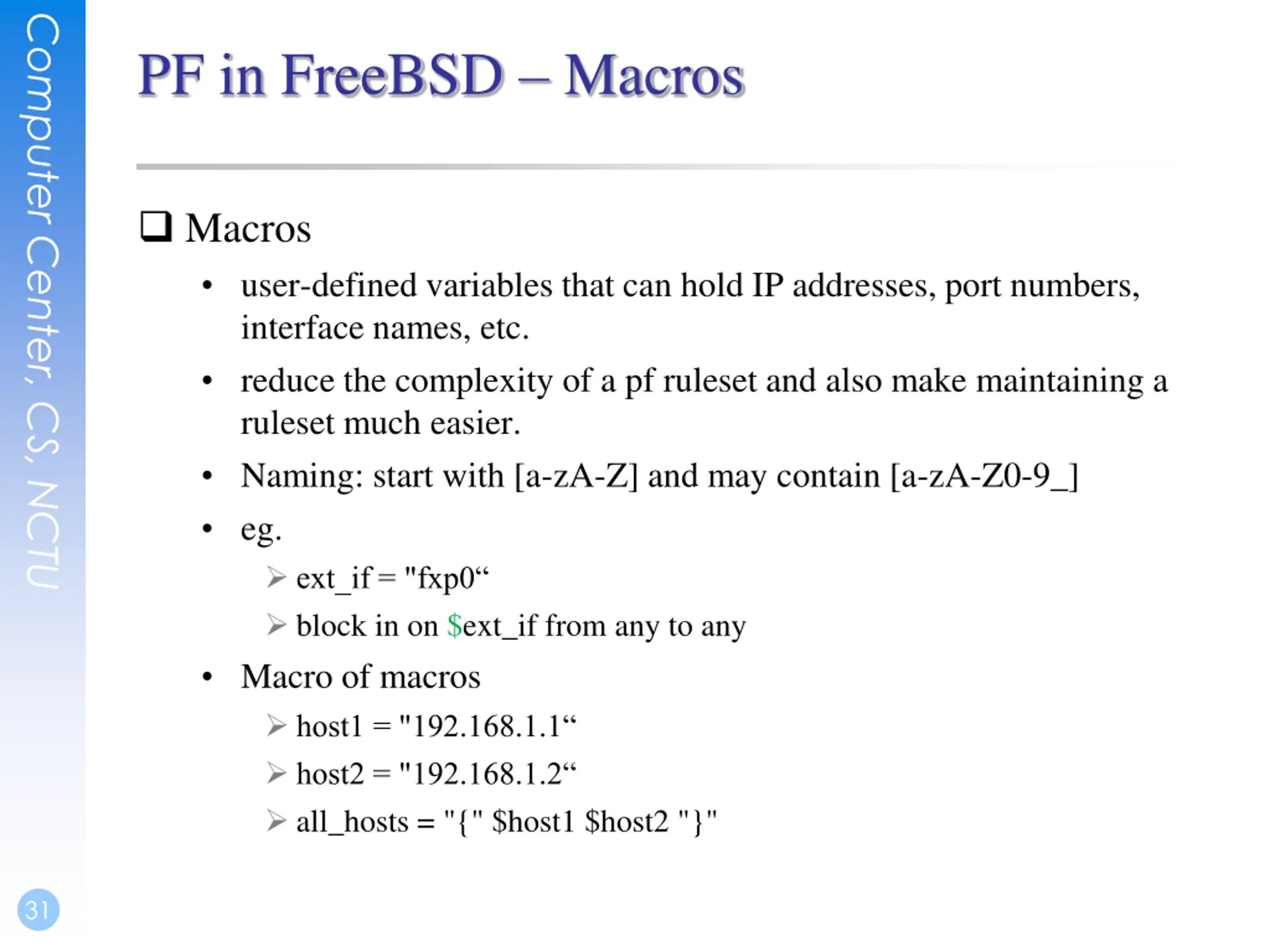 Computer Center, CS, NCTU PF in FreeBSD Macros Macros user-defined variables that can hold IP addresses, port numbers, interface names, etc. reduce the complexity of a pf ruleset and also make maintaining a ruleset much easier. Naming: start with [a-zA-Z] and may contain [a-zA-Z0-9_] eg. ext_if = "fxp0 block in on $ext_if from any to any Macro of macros host1 = "192.168.1.1 host2 = "192.168.1.2 all_hosts = "{" $host1 $host2 "}" 31