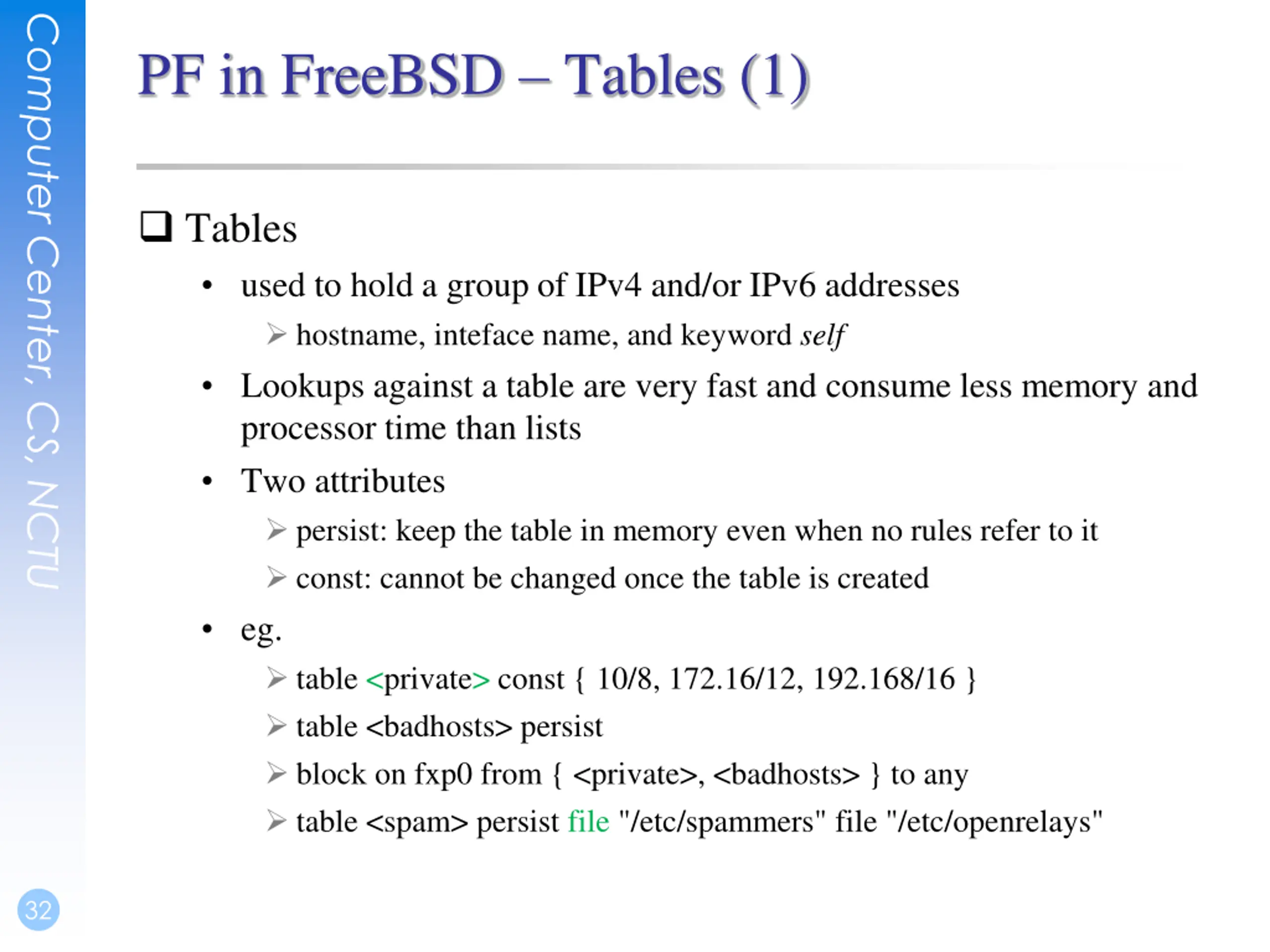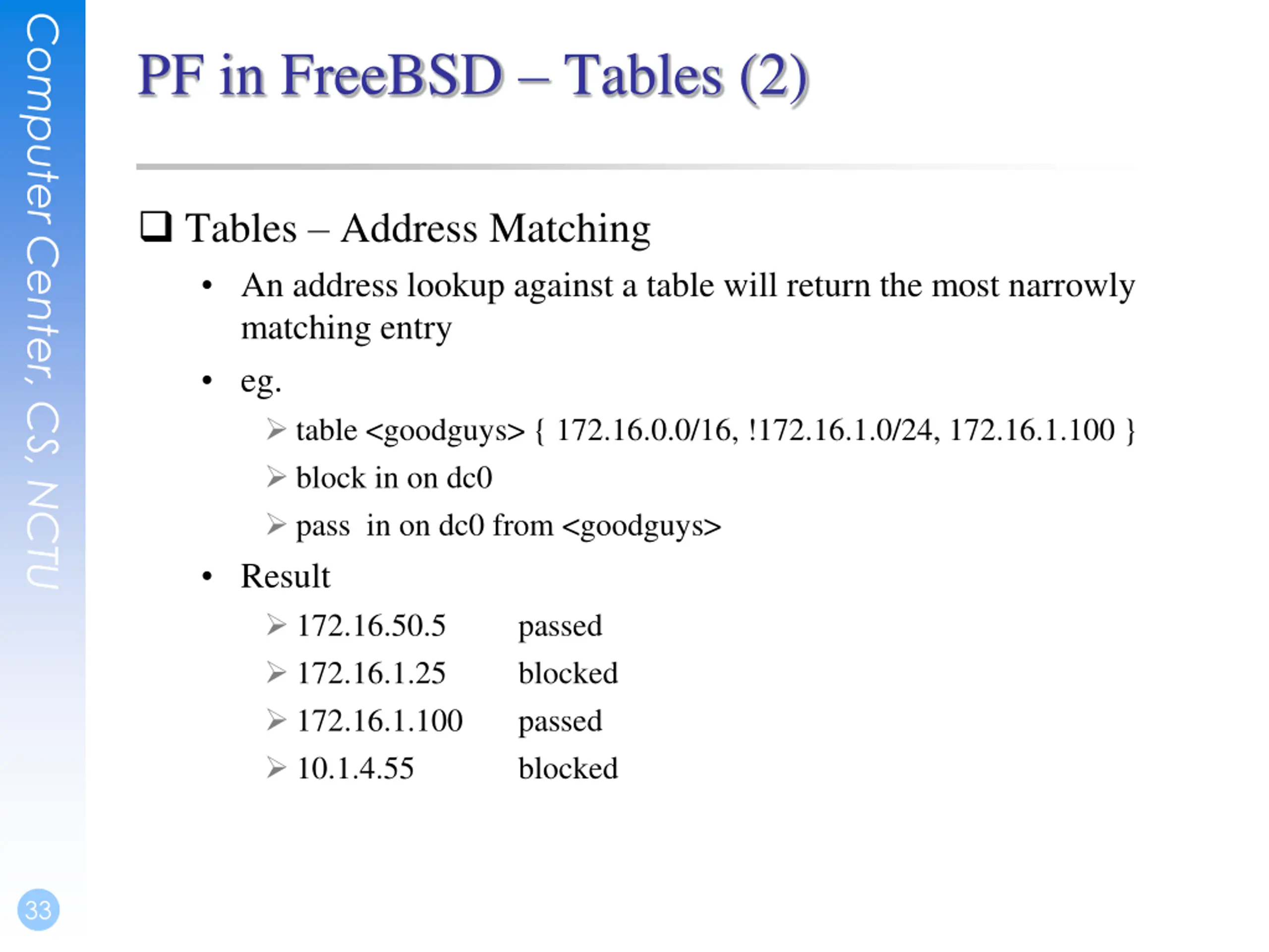 Computer Center, CS, NCTU PF in FreeBSD Tables (1) Tables used to hold a group of IPv4 and/or IPv6 addresses hostname, inteface name, and keyword self Lookups against a table are very fast and consume less memory and processor time than lists Two attributes persist: keep the table in memory even when no rules refer to it const: cannot be changed once the table is created eg. table <private> const { 10/8, 172.16/12, 192.168/16 } table <badhosts> persist block on fxp0 from { <private>, <badhosts> } to any table <spam> persist file "/etc/spammers" file "/etc/openrelays" 32