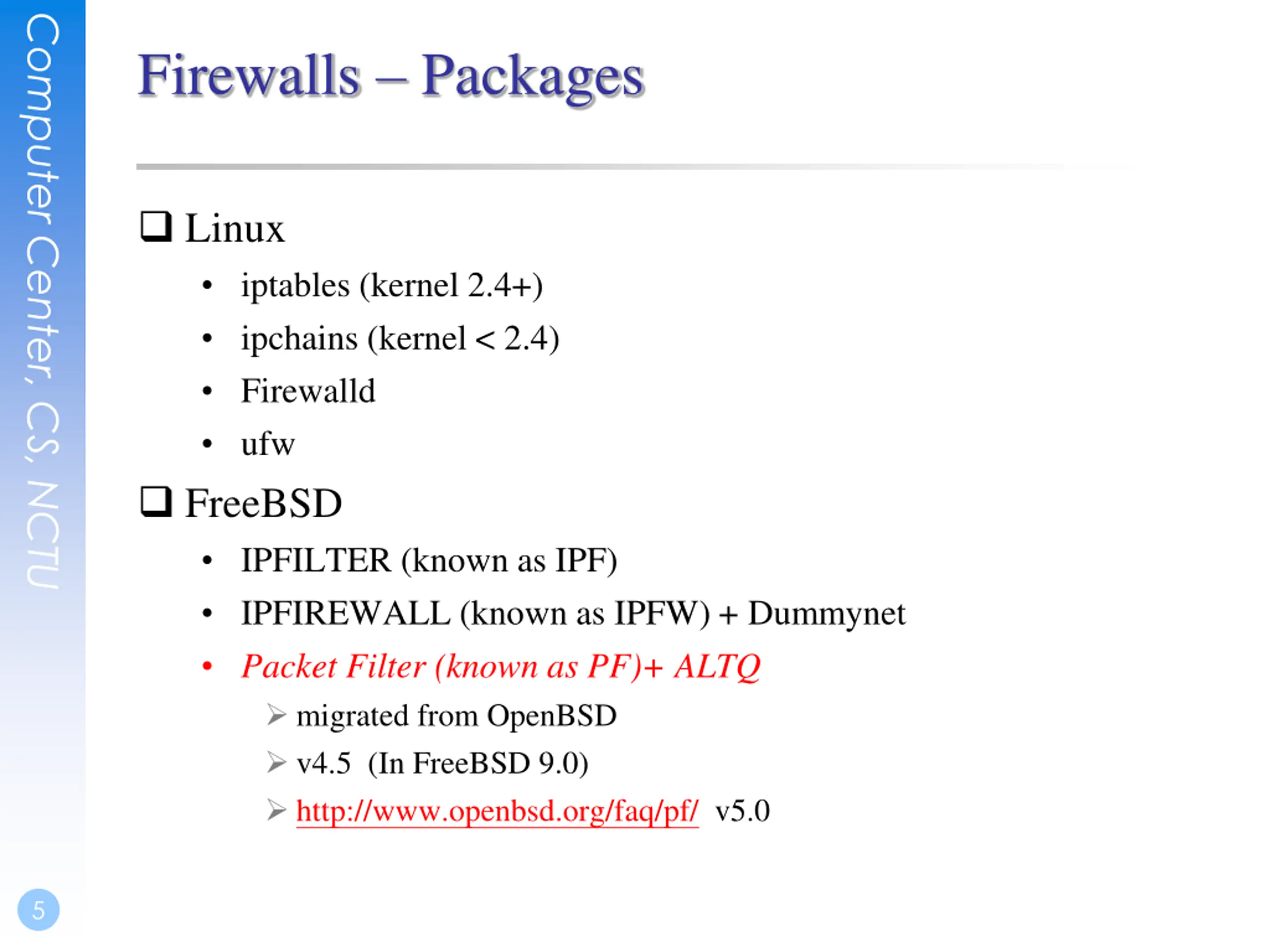 Computer Center, CS, NCTU Firewalls Packages Linux iptables (kernel 2.4+) ipchains (kernel < 2.4) Firewalld ufw FreeBSD IPFILTER (known as IPF) IPFIREWALL (known as IPFW) + Dummynet Packet Filter (known as PF)+ ALTQ migrated from OpenBSD v4.5 (In FreeBSD 9.0) http://www.openbsd.org/faq/pf/ v5.0 5