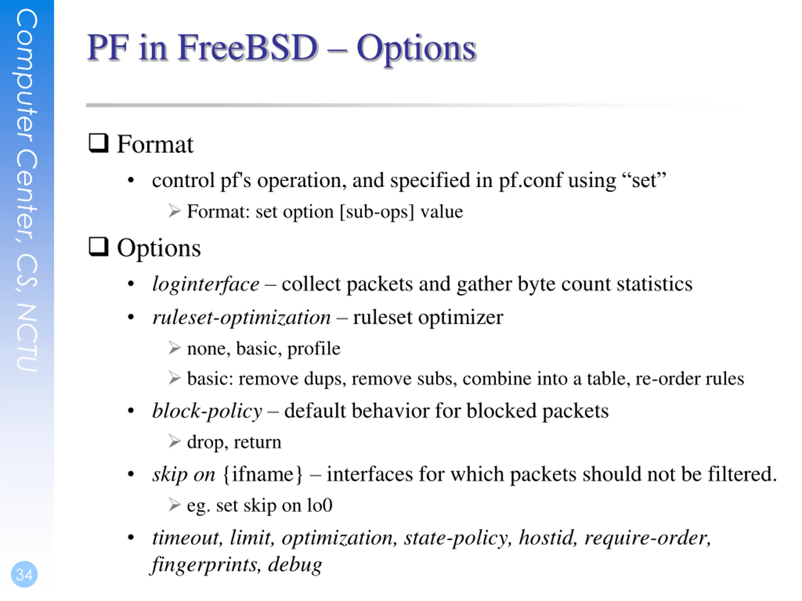 Computer Center, CS, NCTU PF in FreeBSD Options Format control pf's operation, and specified in pf.conf using set Format: set option [sub-ops] value Options loginterface collect packets and gather byte count statistics ruleset-optimization ruleset optimizer none, basic, profile basic: remove dups, remove subs, combine into a table, re-order rules block-policy default behavior for blocked packets drop, return skip on {ifname} interfaces for which packets should not be filtered. eg. set skip on lo0 timeout, limit, optimization, state-policy, hostid, require-order, fingerprints, debug 34