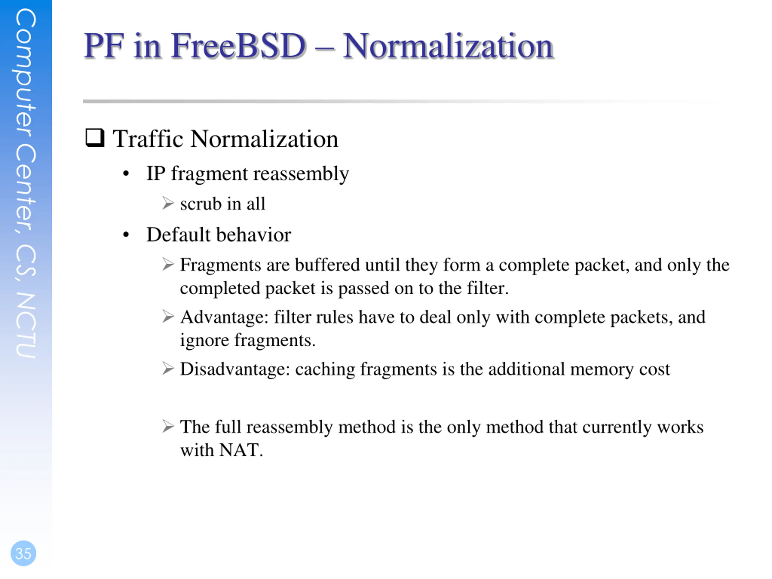 Computer Center, CS, NCTU PF in FreeBSD Normalization Traffic Normalization IP fragment reassembly scrub in all Default behavior Fragments are buffered until they form a complete packet, and only the completed packet is passed on to the filter. Advantage: filter rules have to deal only with complete packets, and ignore fragments. Disadvantage: caching fragments is the additional memory cost The full reassembly method is the only method that currently works with NAT. 35