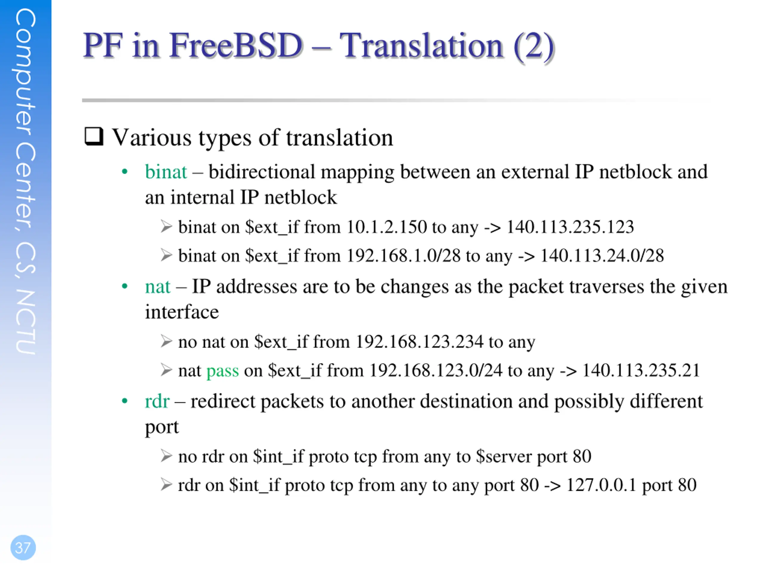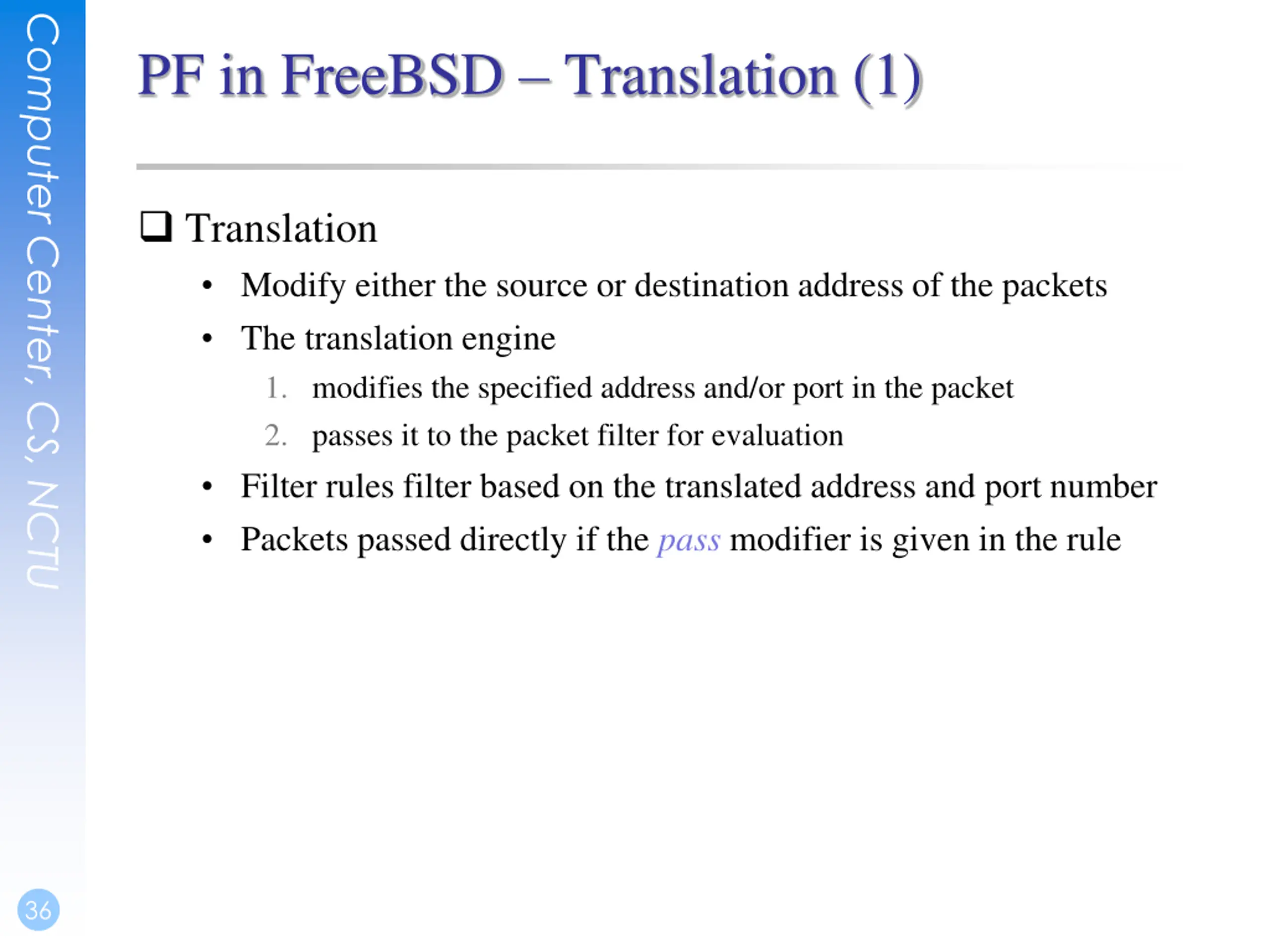 Computer Center, CS, NCTU PF in FreeBSD Translation (1) Translation Modify either the source or destination address of the packets The translation engine 1. modifies the specified address and/or port in the packet 2. passes it to the packet filter for evaluation Filter rules filter based on the translated address and port number Packets passed directly if the pass modifier is given in the rule 36