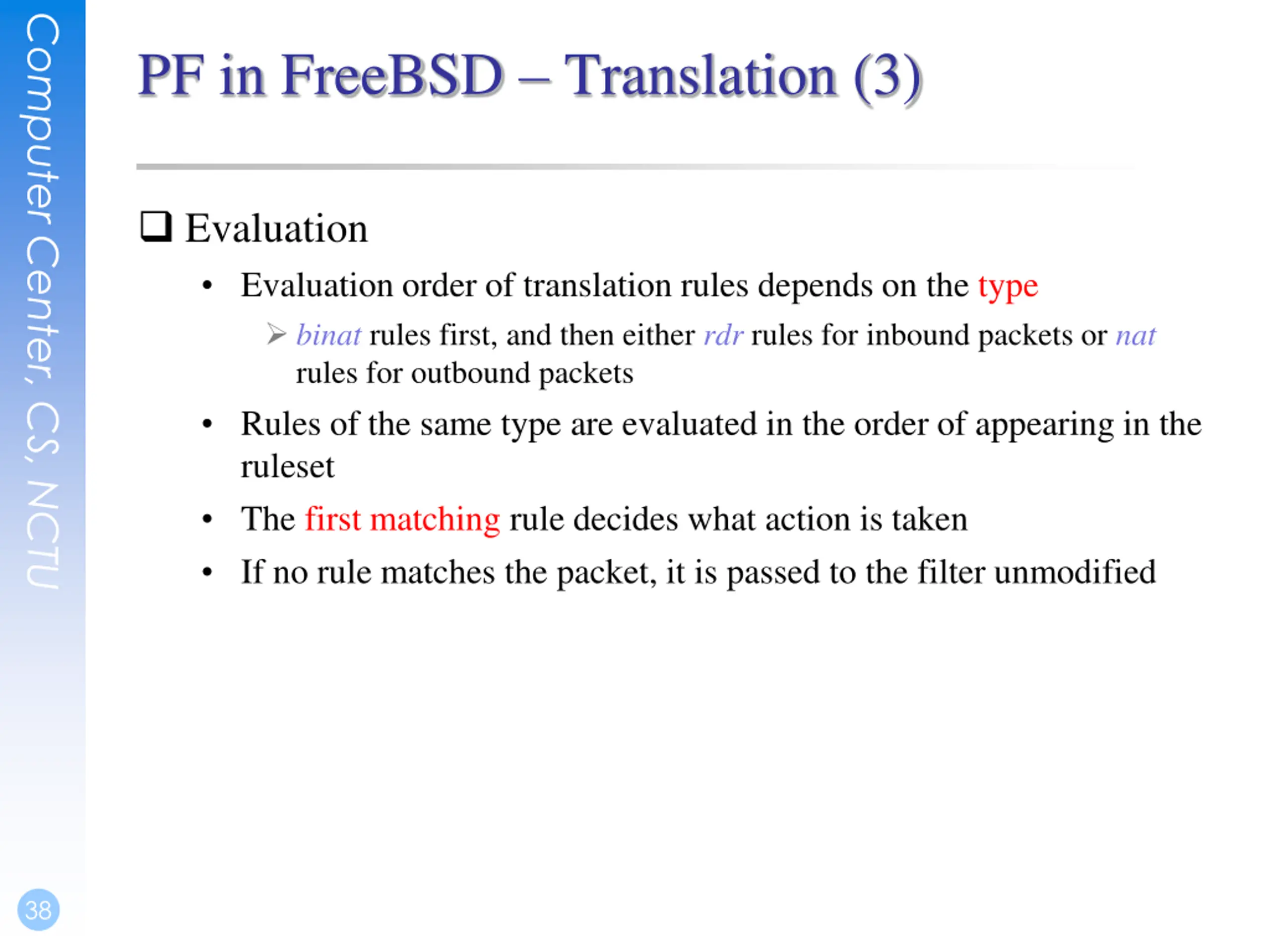 Computer Center, CS, NCTU PF in FreeBSD Translation (3) Evaluation Evaluation order of translation rules depends on the type binat rules first, and then either rdr rules for inbound packets or nat rules for outbound packets Rules of the same type are evaluated in the order of appearing in the ruleset The first matching rule decides what action is taken If no rule matches the packet, it is passed to the filter unmodified 38