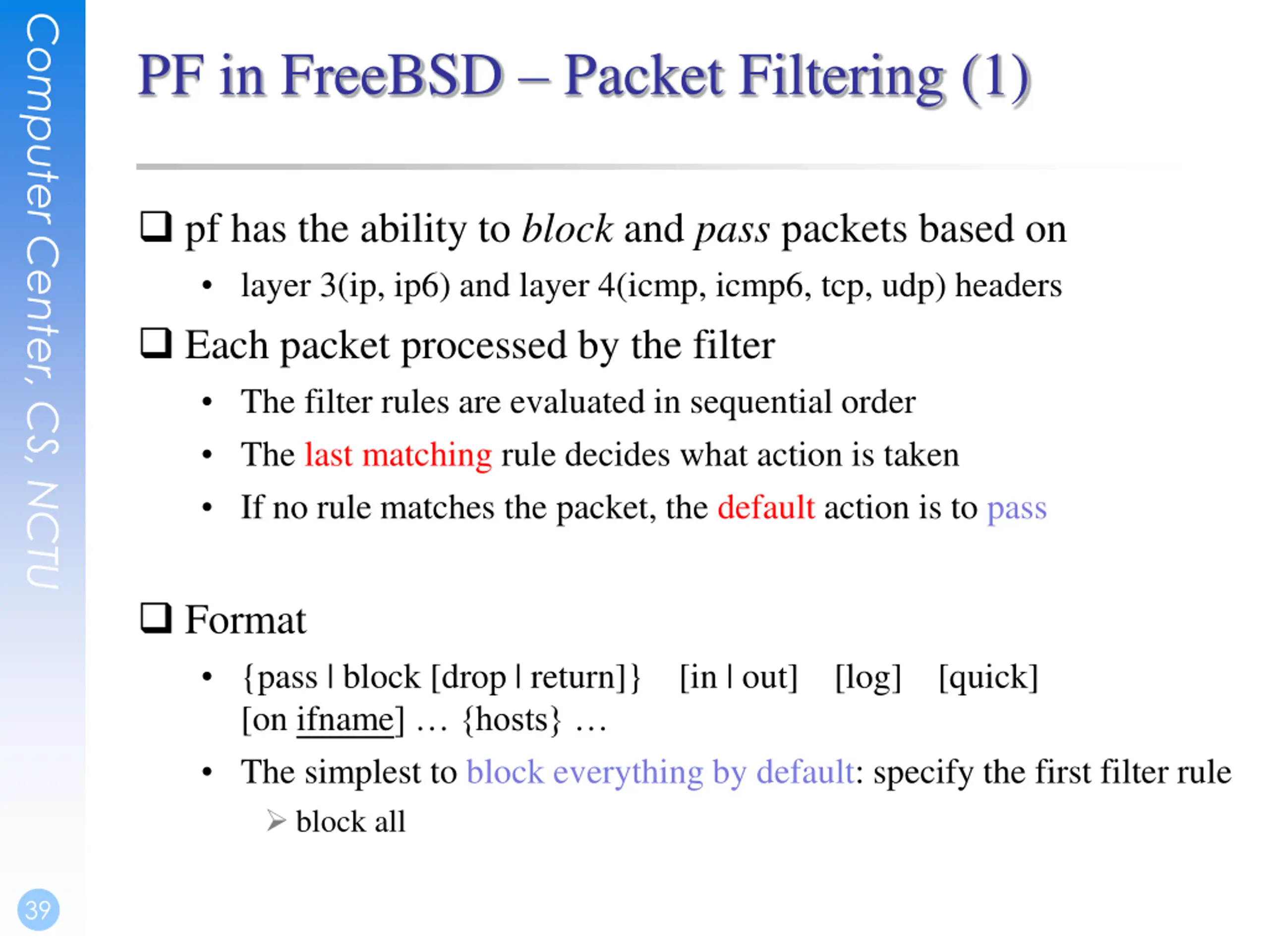 Computer Center, CS, NCTU PF in FreeBSD Packet Filtering (1) pf has the ability to block and pass packets based on layer 3(ip, ip6) and layer 4(icmp, icmp6, tcp, udp) headers Each packet processed by the filter The filter rules are evaluated in sequential order The last matching rule decides what action is taken If no rule matches the packet, the default action is to pass Format {pass | block [drop | return]} [in | out] [log] [quick] [on ifname] {hosts} The simplest to block everything by default: specify the first filter rule block all 39
