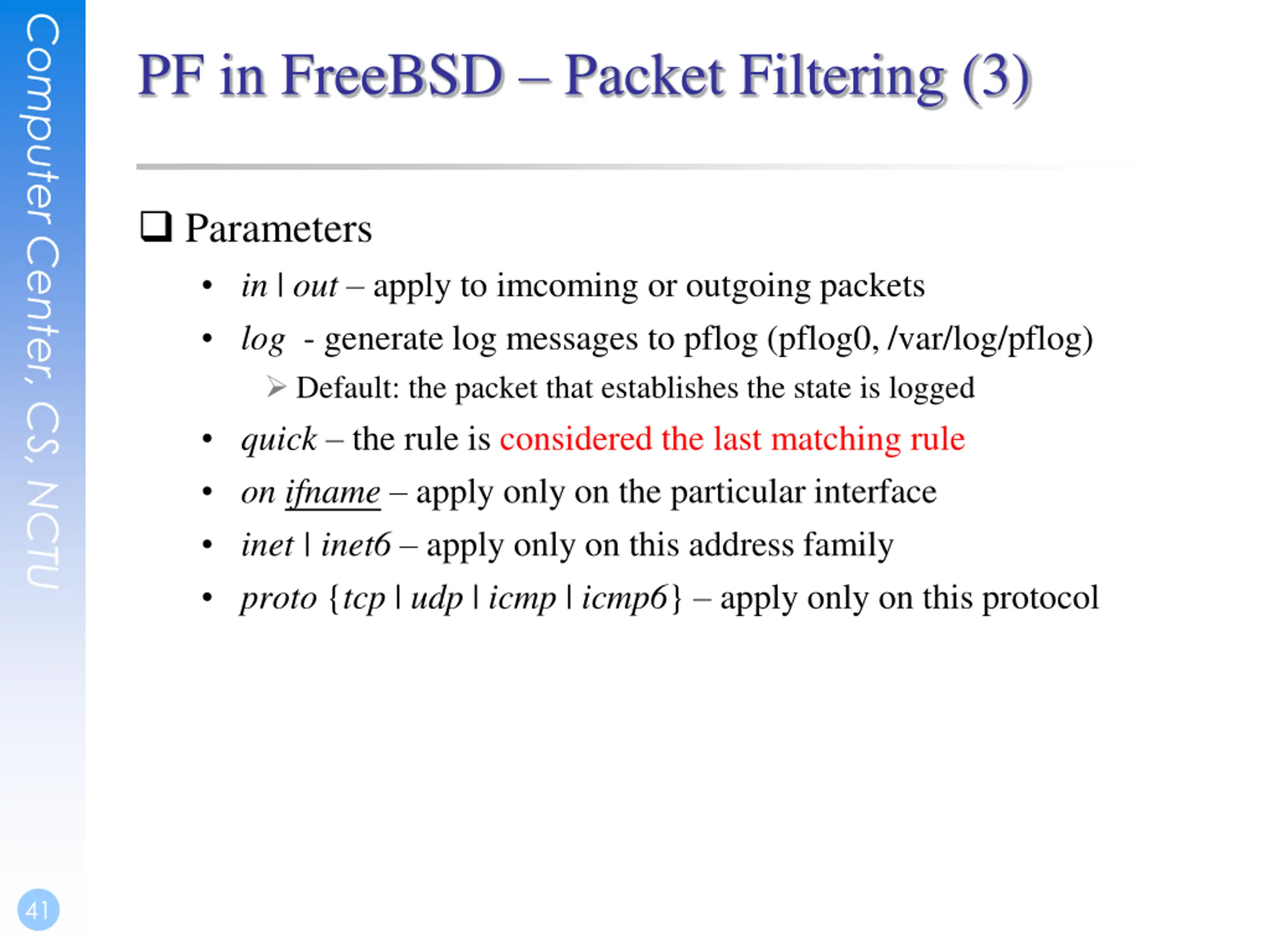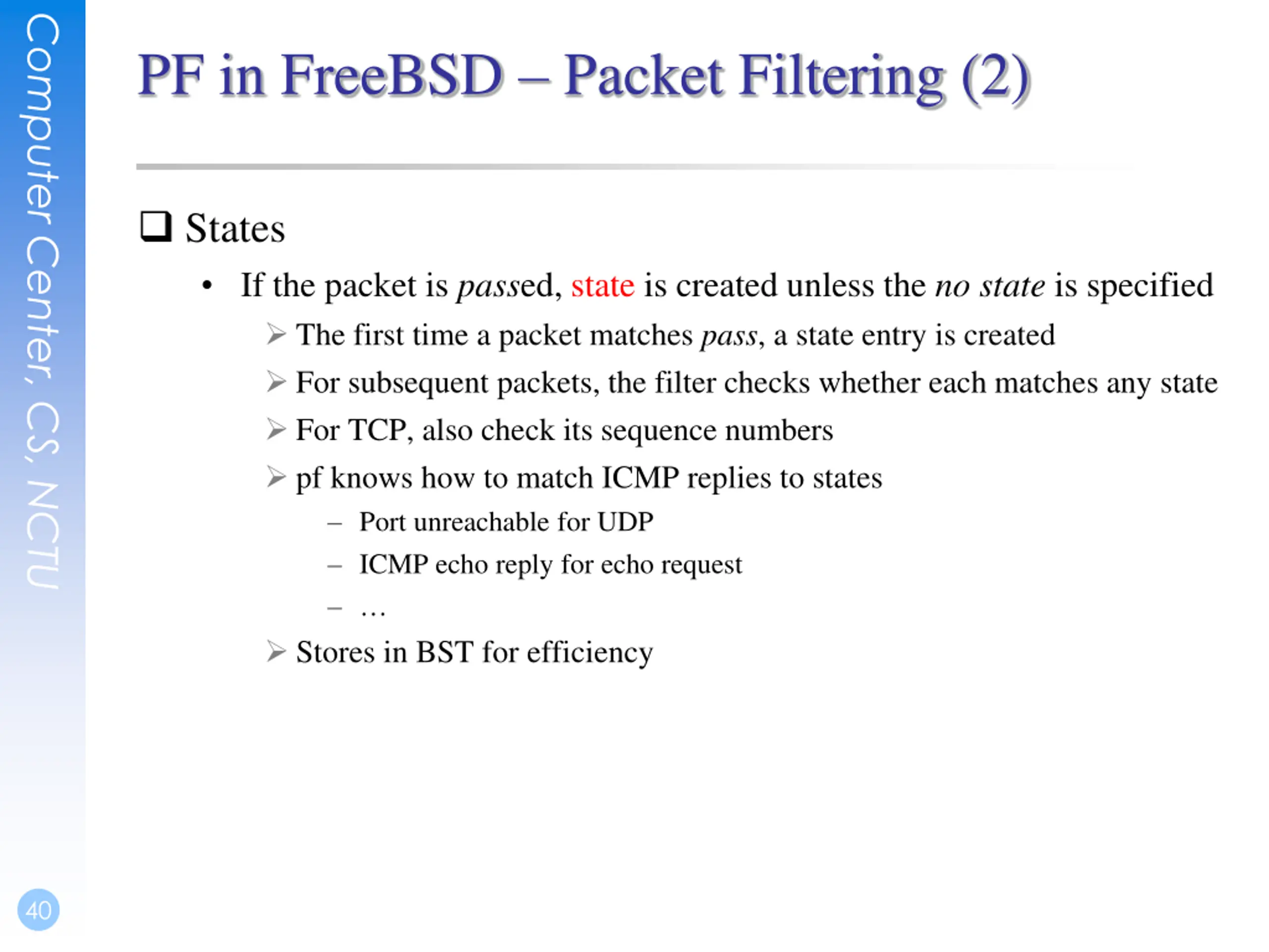 Computer Center, CS, NCTU PF in FreeBSD Packet Filtering (2) States If the packet is passed, state is created unless the no state is specified The first time a packet matches pass, a state entry is created For subsequent packets, the filter checks whether each matches any state For TCP, also check its sequence numbers pf knows how to match ICMP replies to states Port unreachable for UDP ICMP echo reply for echo request Stores in BST for efficiency 40